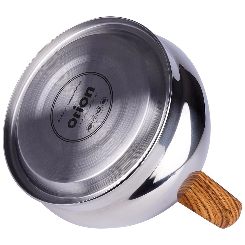 Klasyczny czajnik wykonany ze stali nierdzewnej. Efektownie wykończony bakelitem przypominającym drewno. Czajnik jest przydatny w kuchni. Wygodny w użytkowaniu dzięki rączce, uchwytowi oraz automatycznemu gwizdkowi. Czajnik nie będzie zmieniać smaku wody oraz jest energooszczędny a wodę zagotujemy w nim bardzo szybko. Jest świetną alternatywą dla czajników elektrycznych. Czajnik jest również świetnym pomysłem na prezent. UWAGA! Czajnik do gotowania musi być napełniony co najmniej do połowy aby zapobiec przegrzaniu. Zmiany koloru na powierzchni zewnętrznej w przypadku nieprzestrzegania minimalnych parametrów użytkowych nie mogą być powodem do reklamacji. Oryginalny produkt czeskiej marki Orion. Wyprodukowano zgodnie z europejskimi standardami.