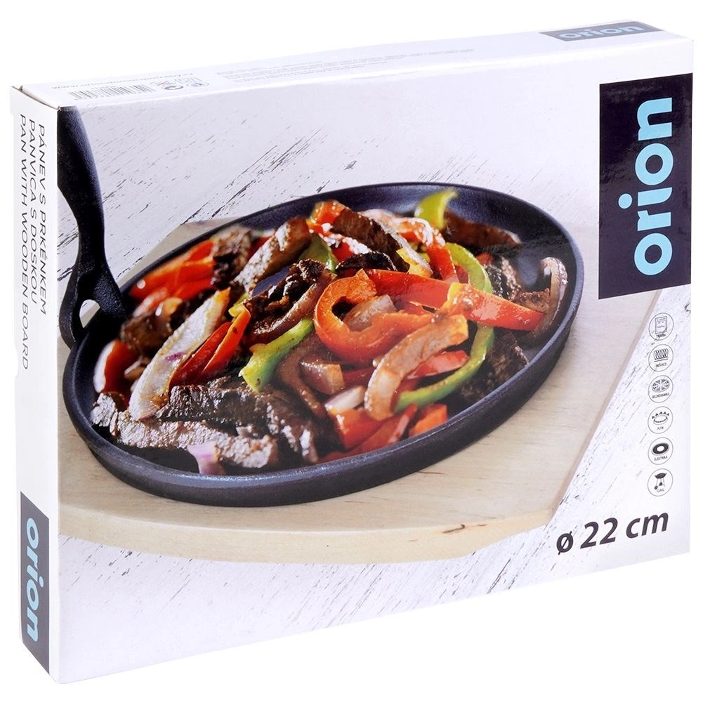 - Patelnia ma średnicę 22 cm i wysokość 2 cm, deska ma wymiary 27 x 23 cm, uchwyt 13 x 2,5 x 4 cm.