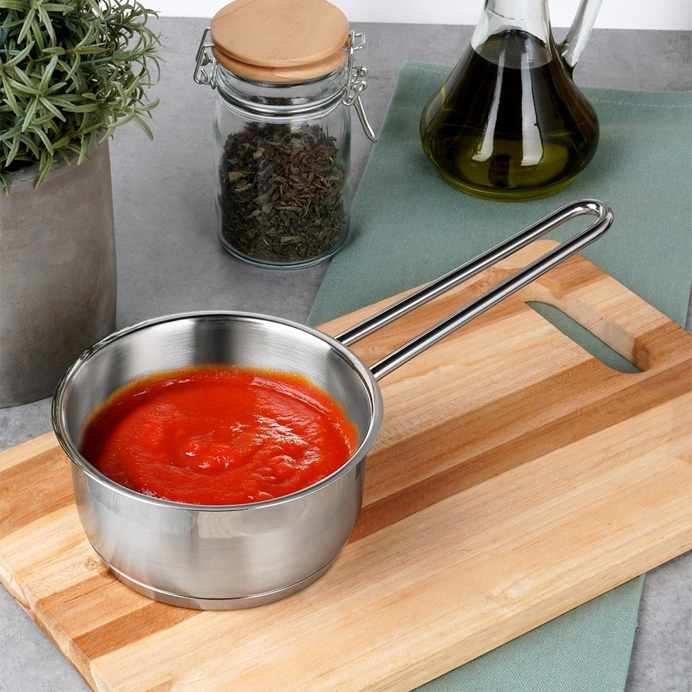 - Garnek wykonany z wysokiej jakości stali nierdzewnej . Dno akutermiczne wielowarstwowe, uchwyt stalowy. Nadaje się na każdy rodzaj kuchenek - również indukcję.