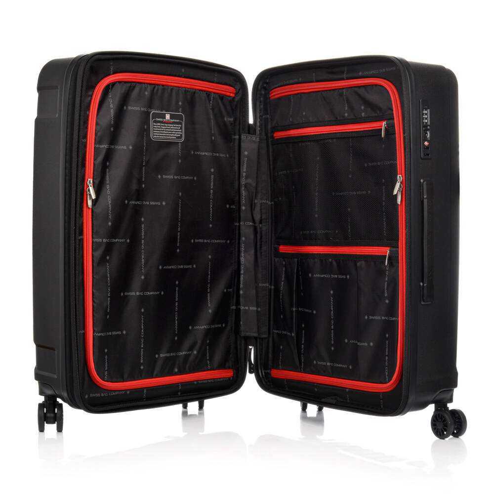 Wnętrze walizki jest podzielone na dwie części. Dolna komora posiada regulowane pasy, uniemożliwiające przesuwanie się bagażu. Całość dopełnia elegancka