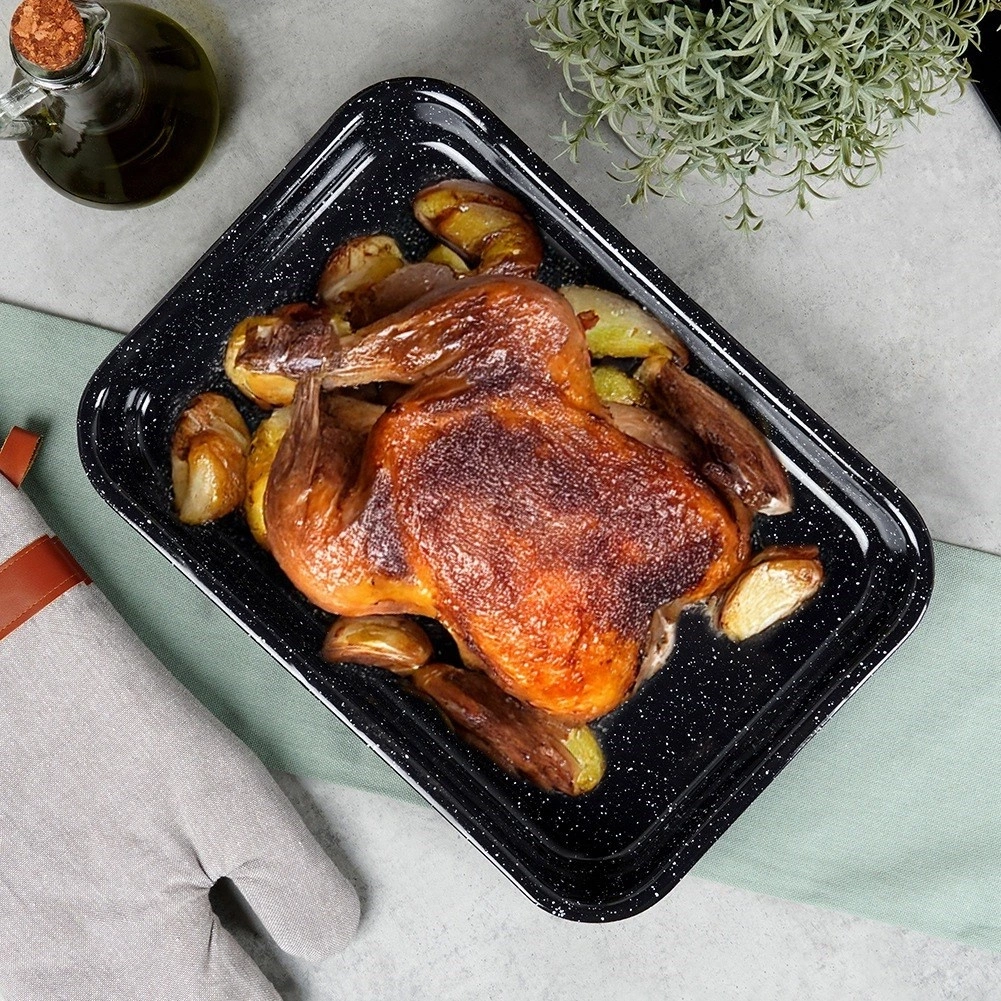 - Blacha wykonana ze stali emaliowanej. Idealna do pieczenia, smażenia wszystkich rodzajów mięs oraz wielu innych potraw. Łatwa w utrzymaniu czystości - potrawy nie przywierają.