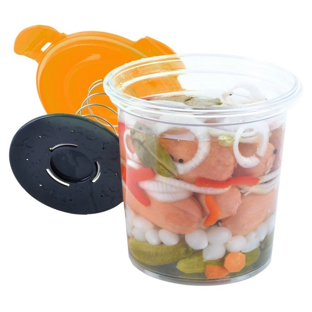 - Pojemnik do marynowania wyposażony w pokrywę sprężynową dzięki której możemy mocno ścisnąć marynowaną żywność.