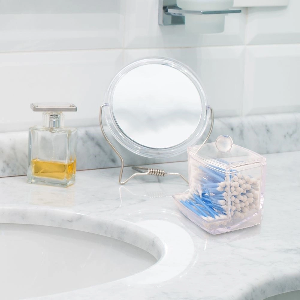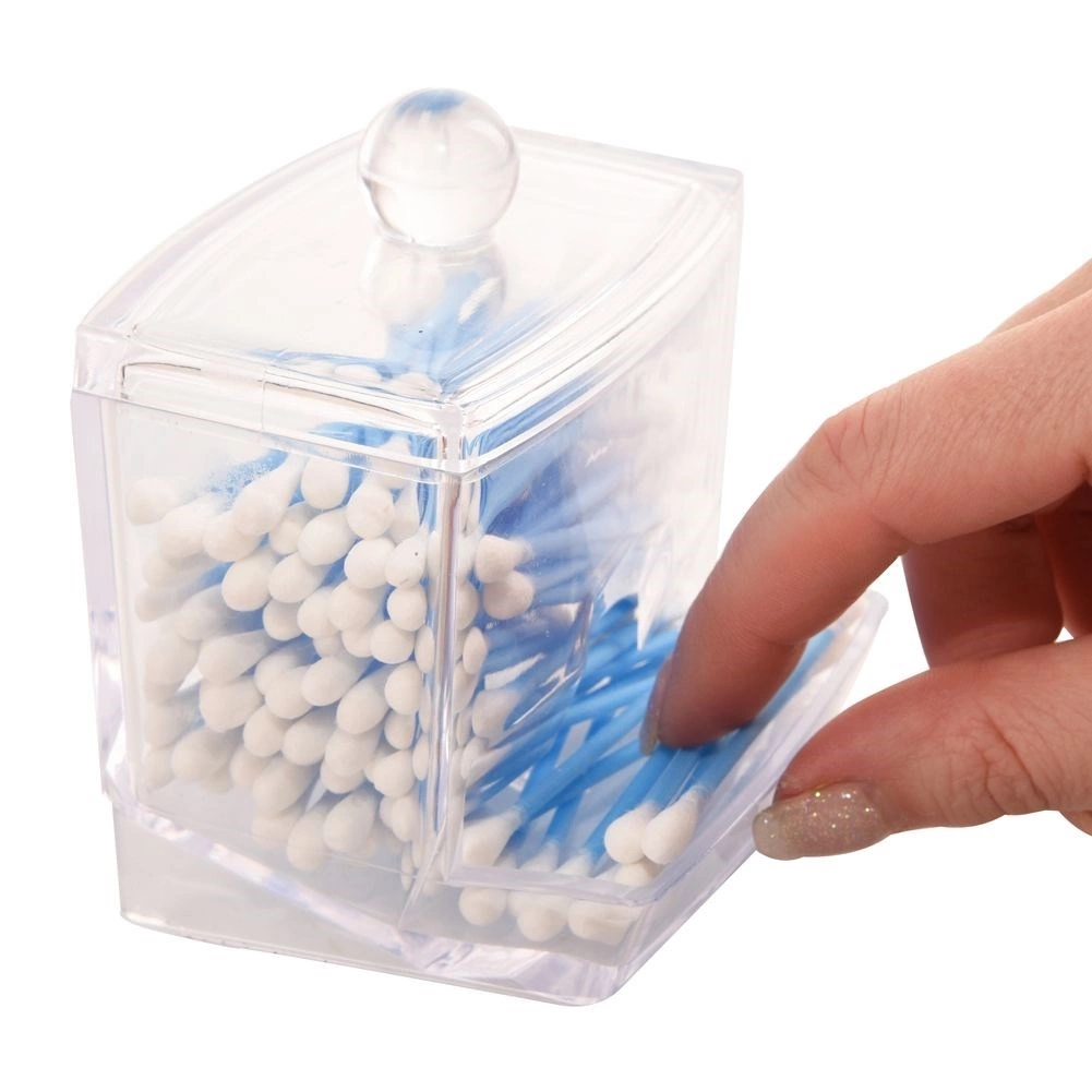 - Praktyczny pojemnik do przechowywania patyczków kosmetycznych o wymiarach 9 x 7 x 9,5 cm.