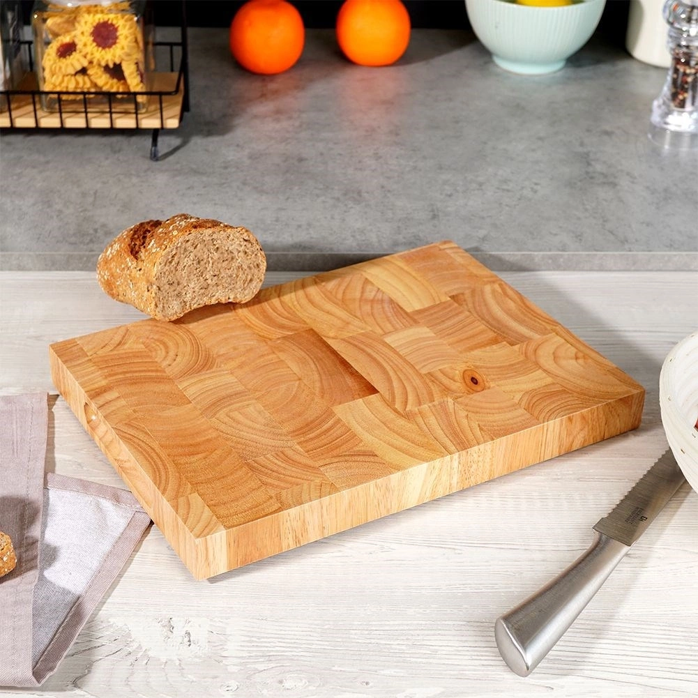 - Solidna, drewniana deska do krojenia - jest zlepiona z małych drewnianych, kwadratowych bloków. Po bokach zgłębienia dla łatwego przenoszenia.