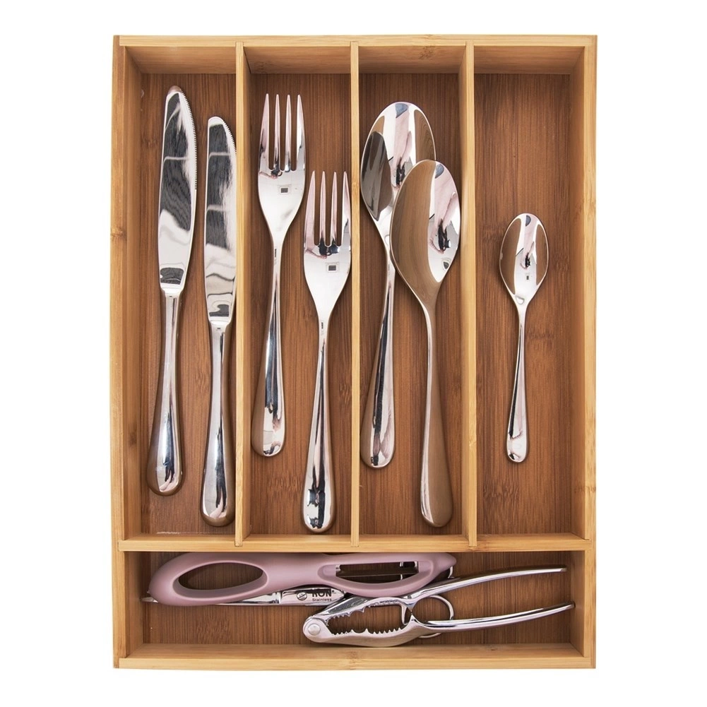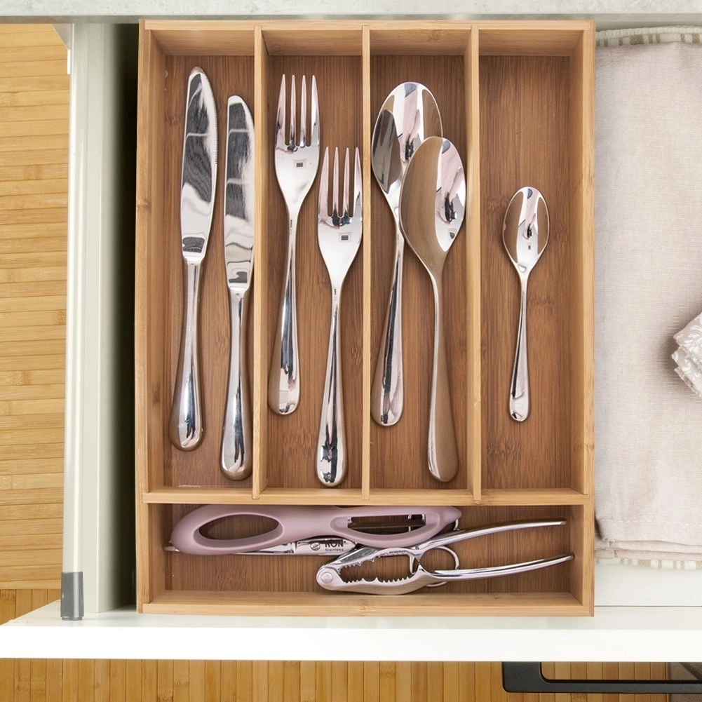 - Organizer do szuflady na sztućce, noże, akcesoria kuchenne. Wykonany z drewna bambusowego. Idealne rozwiązanie dla każdego kto ceni sobie funkcjonalność.