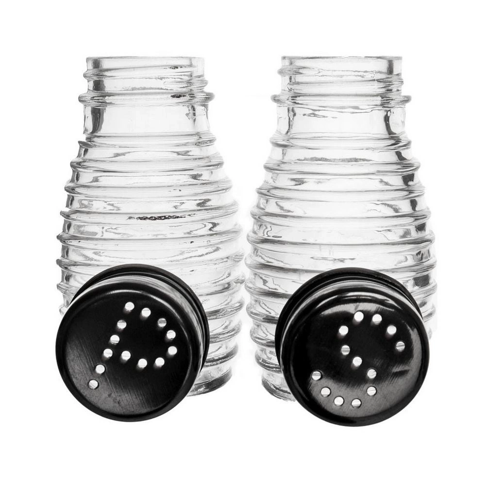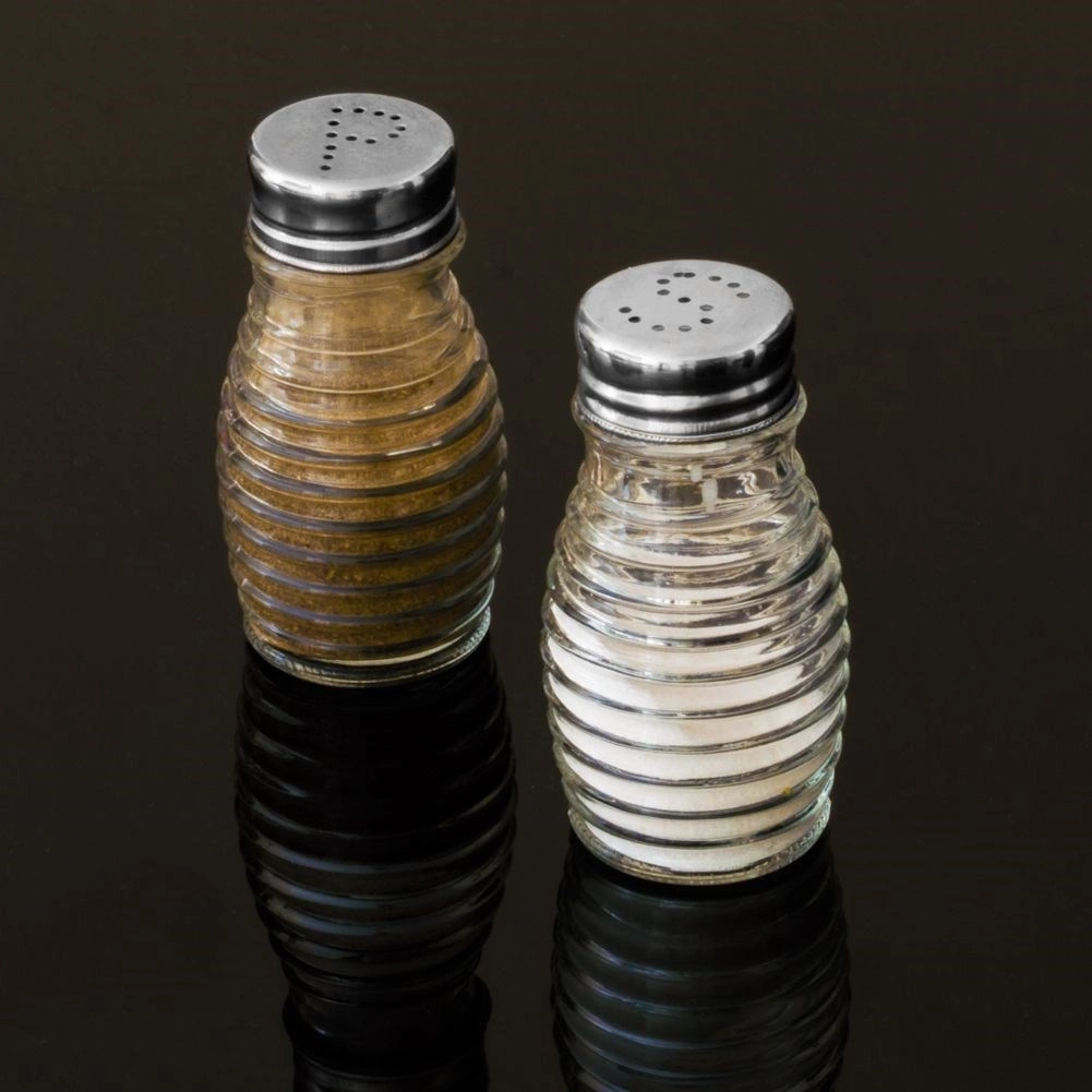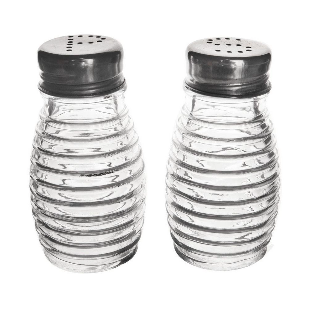Zestaw dwóch pojemników na sól i pieprz. Każdy z pojemników ma średnicę 5 cm a wysokość 8,5 cm. Wykonane z wysokiej jakości przezroczystego szkła. Idealne do wykorzystania w domu, ale również w restauracji, barze itp. Wyprodukowano zgodnie z europejskimi standardami.