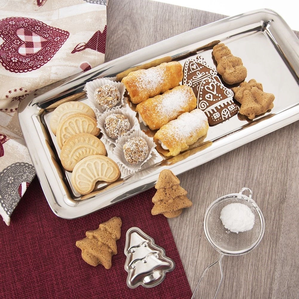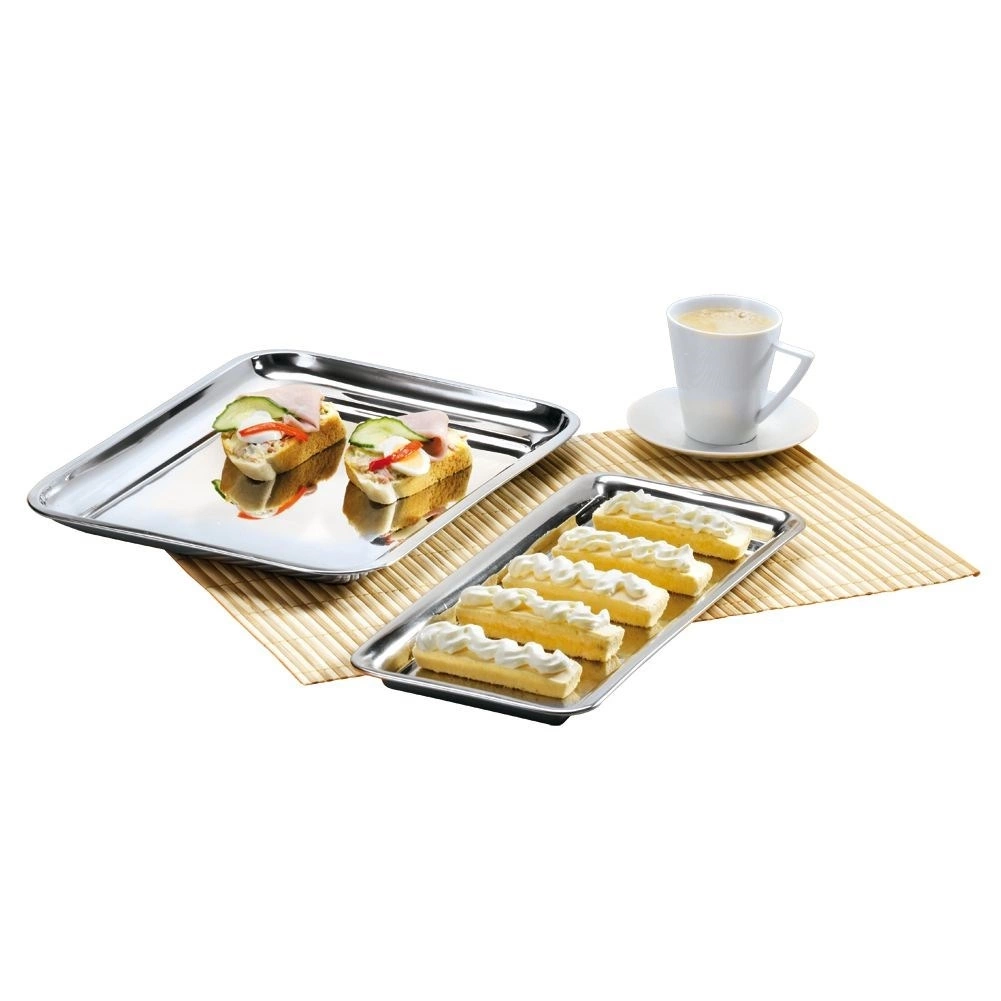 - Prostokątna taca do serwowania kanapek, przekąsek, przystawek oraz ciasteczek. Ładnie wykonana, solidna, nie wykrzywia się. Wykonana ze stali nierdzewnej.