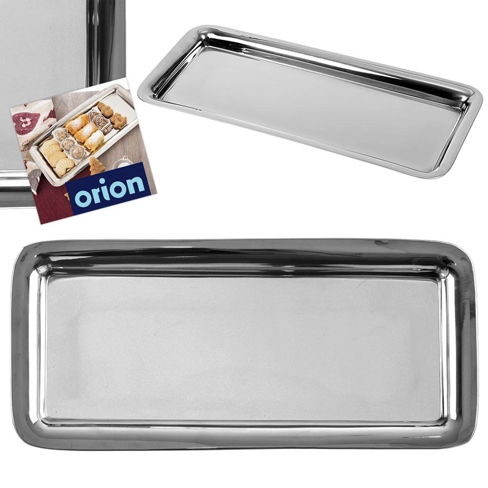 Prostokątna taca o wymiarach 40 x 18 x 2 cm. Przydatna do serwowania kanapek, przekąsek, przystawek oraz ciasteczek. Ładnie wykonana, solidna, nie wykrzywia się. Wykonana ze stali nierdzewnej. Taca przyda się zarówno w domu podczas przyjęć, będziemy mogli wówczas serwować na niej przekąski, kanapki, ale również ciasteczka czy potrawy. Taca może być również używana w gastronomii zarówno do serwowania jak i układania np. ulepionych pierogów, klusek itp. Oryginalny produkt czeskiej marki Orion. Wyprodukowano zgodnie z europejskimi standardami.