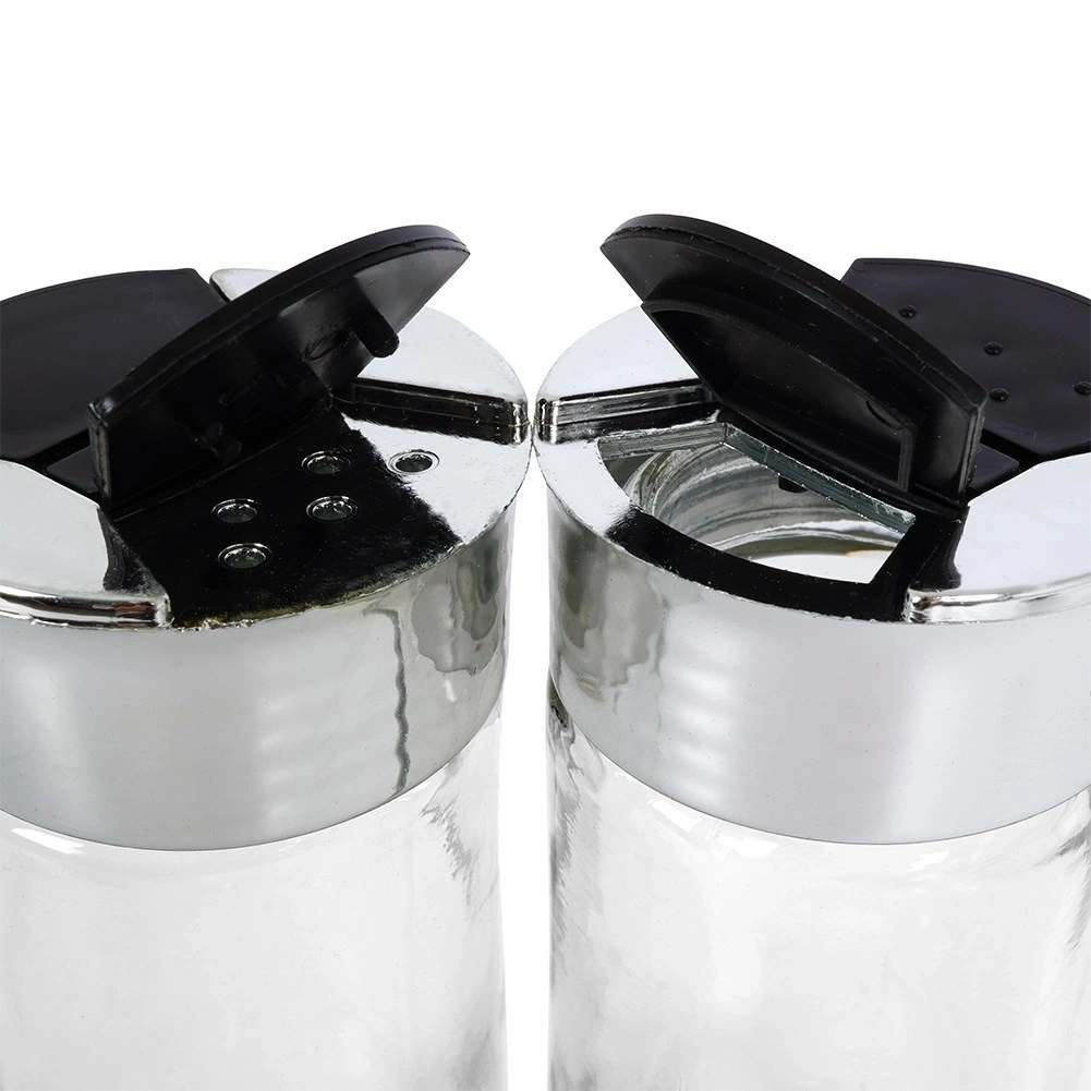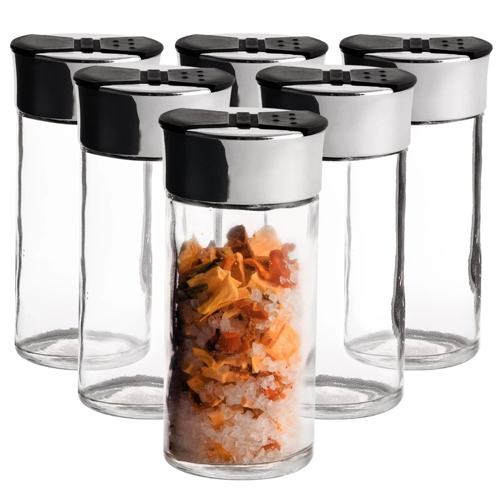 - Pojemniki mają pojemność 100 ml i wymiary 4 x 4 x 10 cm, są wykonane ze szkła z plastikowymi zakrętkami, wyposażone w otwory dla łatwego dozowania przypraw. Otwory zamykane za pomocą praktycznej klapki, dzięki czemu przyprawy dłużej pozostaną świeże.