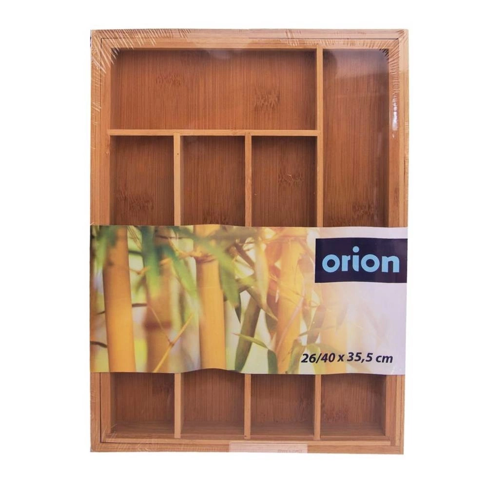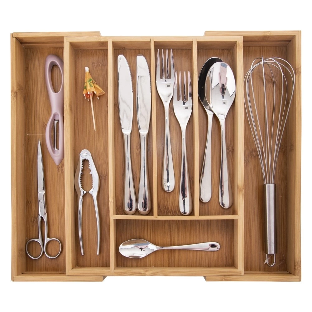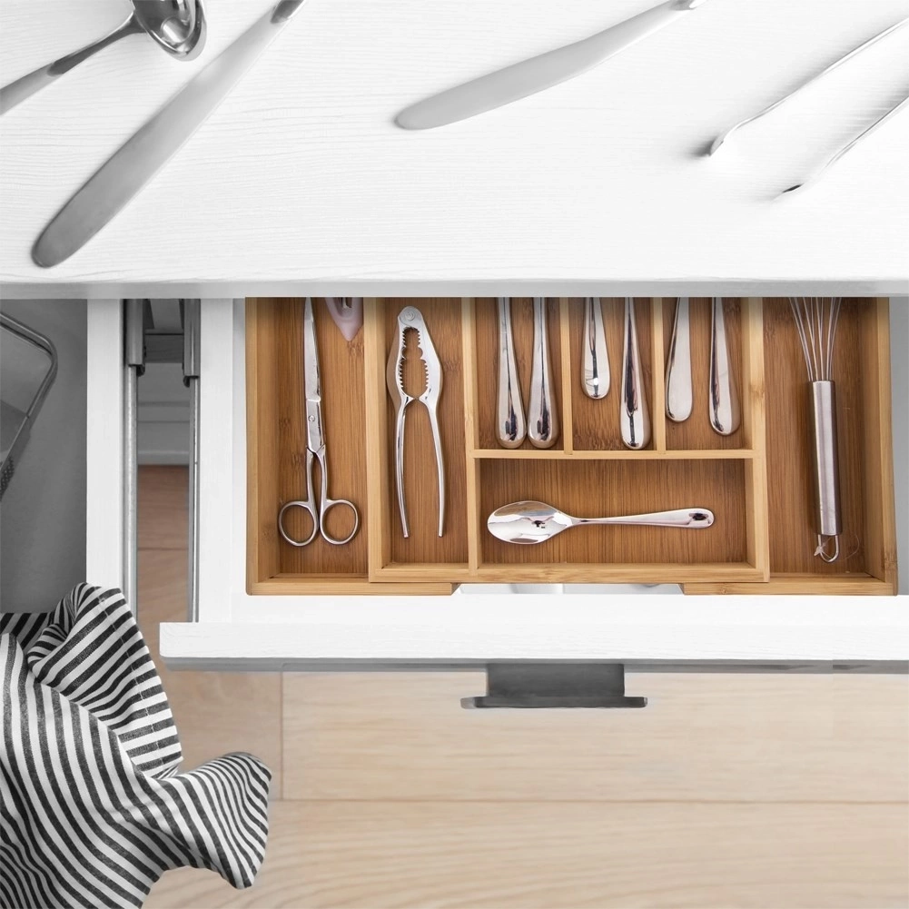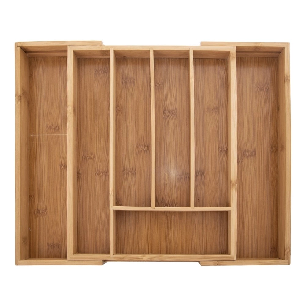 - Regulowany organizer na sztućce oraz przybory kuchenne do szuflady wykonany z drewna bambusowego.