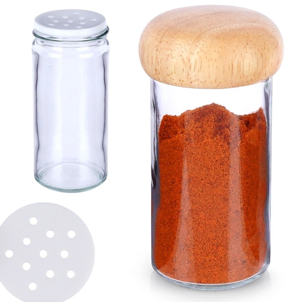 - Pojemnik wykonany ze szkła z drewnianą zakrętką, wyposażony w otwory dla łatwego dozowania przypraw.