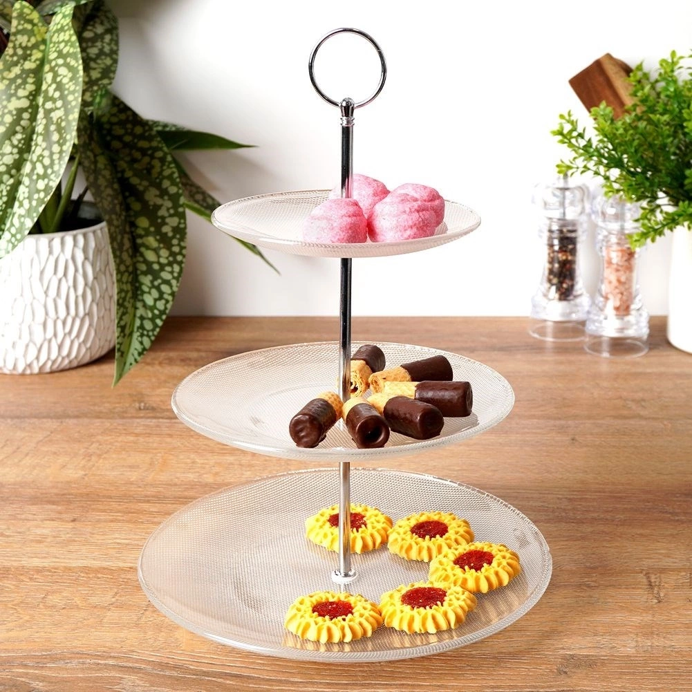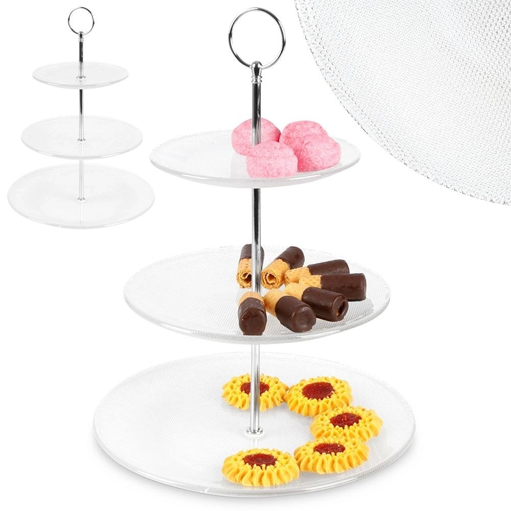 - Piętrowa patera na ciastka, ciasto, owoce, przystawki, przekąski. Posiada 3 poziomy składające się z tac wykonanych ze szkła a mocowanie ze stali nierdzewnej.