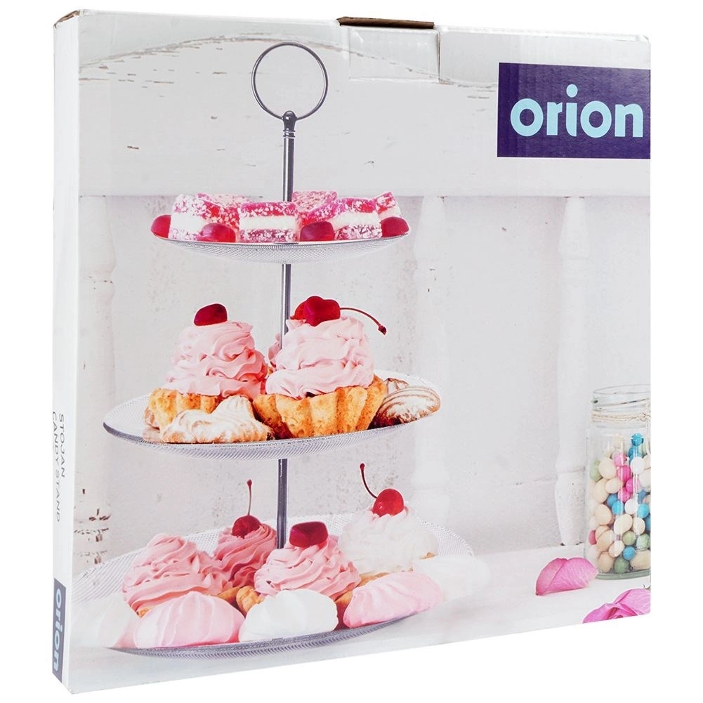 Trzypiętrowa patera do serwowania oraz ekspozycji. Świetnie prezentować się będą na niej babeczki, ciasteczka, różnego rodzaju desery jak również przystawki. Idealnie sprawdzi się do przygotowania słodkich stołów, dzięki niej w efektowny sposób wyeksponujemy na stole słodkości oraz słone przekąski. Sprawdzi się do użytku domowego oraz profesjonalnego. Oryginalny produkt czeskiej marki Orion. Wyprodukowano zgodnie z europejskimi standardami.
