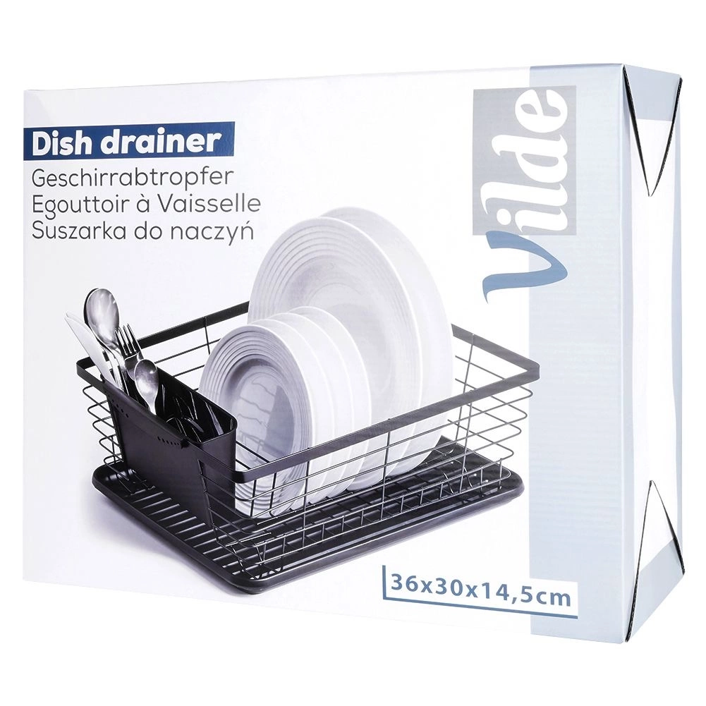 Kompaktowa suszarka na naczynia z wygodnymi rączkami. Suszarka jest pojemna, przydatna w każdej kuchni. Jest elegancko wykończona, a zarazem funkcjonalna. Łatwa w czyszczeniu. Posiada wyjmowaną tacę ociekową, dzięki czemu utrzymanie jej w czystości nie stanowi problemu. Oryginalny produkt marki Vilde. Wyprodukowano zgodnie z europejskimi standardami.