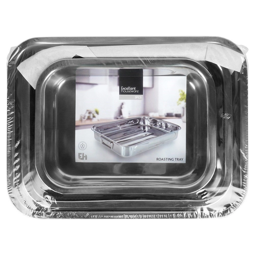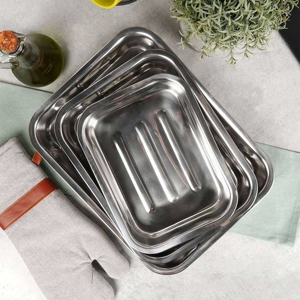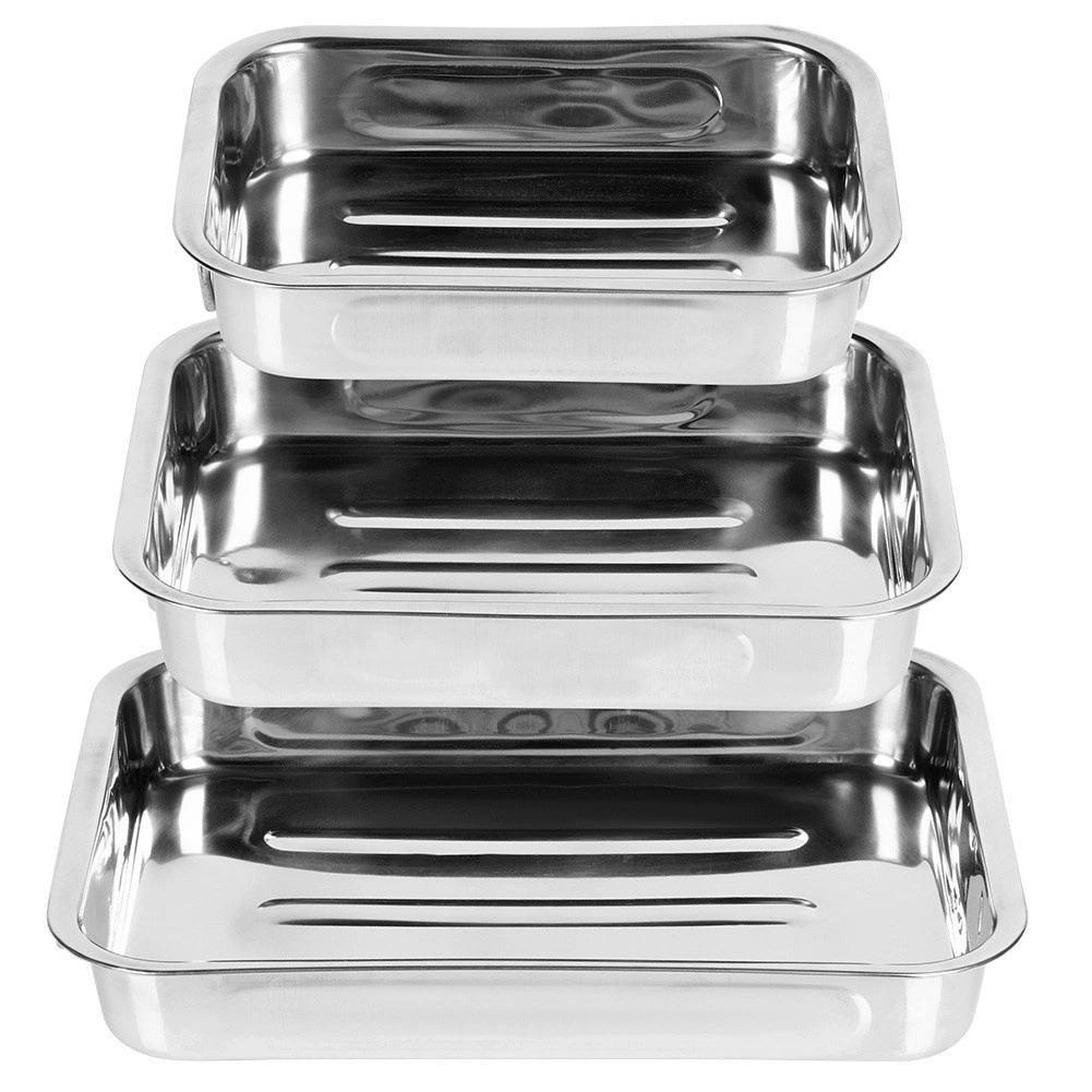 - STALOWE - Zestaw trzech stalowych blach do pieczenia o uniwersalnym zastosowaniu. Blachy posiadają grube i solidne ścianki boczne naczynia a wykorzystana w nich stal nierdzewna, polerowana jest na wysoki połysk. W zestawie: mała brytfanna o wymiarach 27,5 x 20,5 x 5,5 cm, średnia brytfanna 32 x 24,5 x 5,5 cm, duża brytfanna 37 x 28 x 5,5 cm.