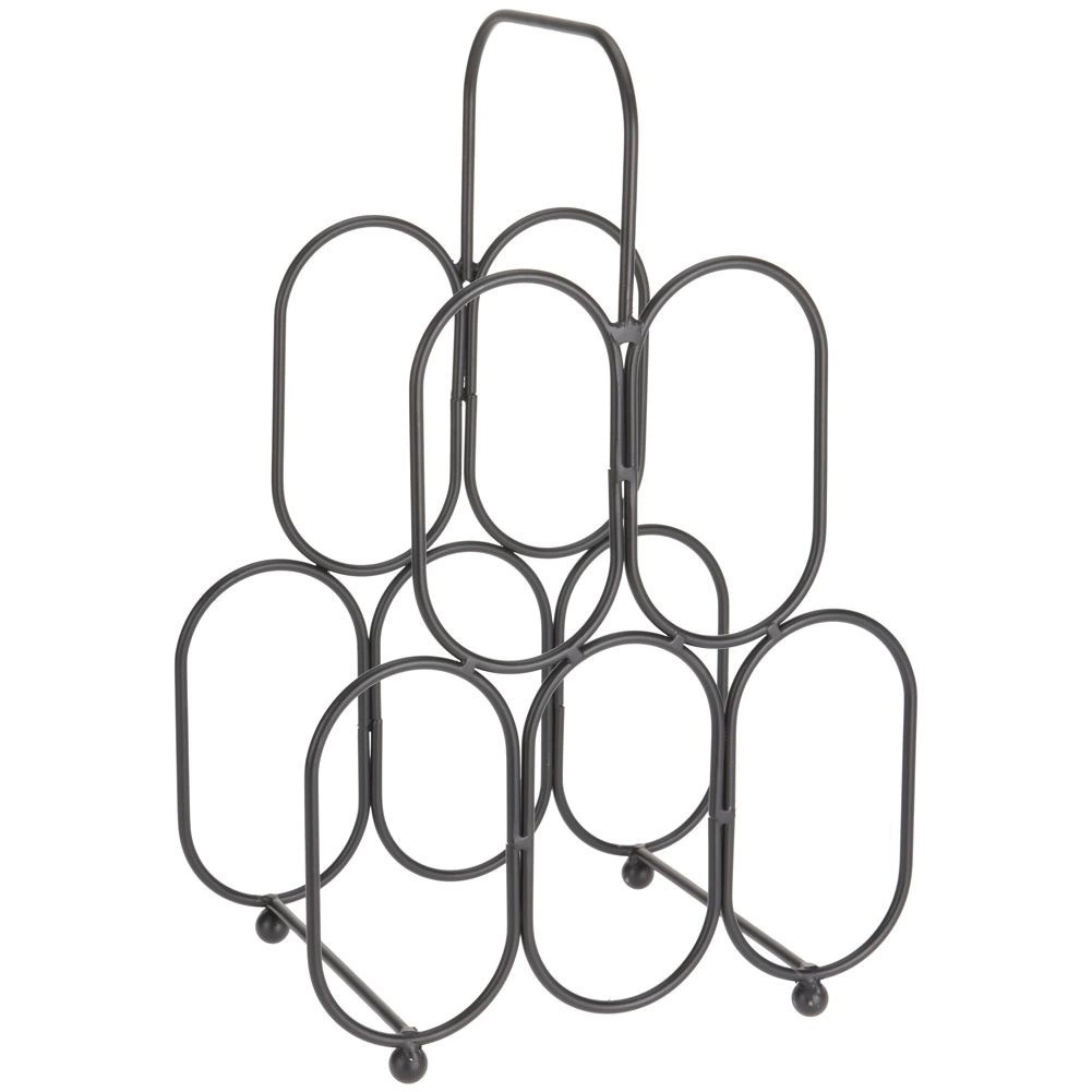 Praktyczny stojak na 5 butelek wina lub innych alkoholi. Stojak ma wymiary 40,5 x 27 cm. Wykonany z wysokiej jakości metalu w kolorze czarnym. Z jego pomocą w oryginalny sposób wyeksponujesz wino lub inne trunki zachowując odpowiednią pozycję przechowywania. Będzie idealnie pasował do każdego wnętrza. Świetny pomysł na prezent np. z okazji parapetówki. Oryginalny produkt holenderskiej marki Home Styling Collection. Wyprodukowano zgodnie z europejskimi standardami.