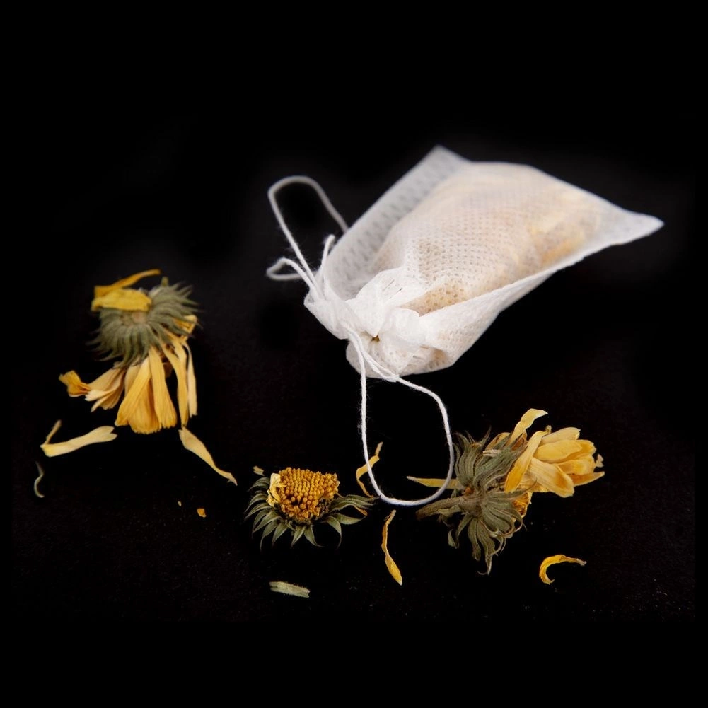 Zestaw 100 sztuk torebek tekstylnych do zaparzania herbaty, ziół oraz kawy.