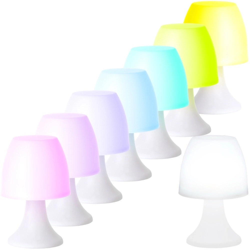 Lampka stołowa LED o wysokości 19 cm i średnicy 12 cm. Wykonana z lekkiego tworzywa w kolorze białym. Sprawdzi się zarówno w salonie, sypialni, jak również w pokoju dziecięcym. Dzięki niej dziecko będzie mogło zasypiać czy świetle. Posiada dwie funkcje świecenia - na biały kolor oraz w trybie wielokolorowym. Zasilanie 3x bateria AAA 1,5V (brak w zestawie). Wyprodukowano zgodnie z europejskimi standardami.