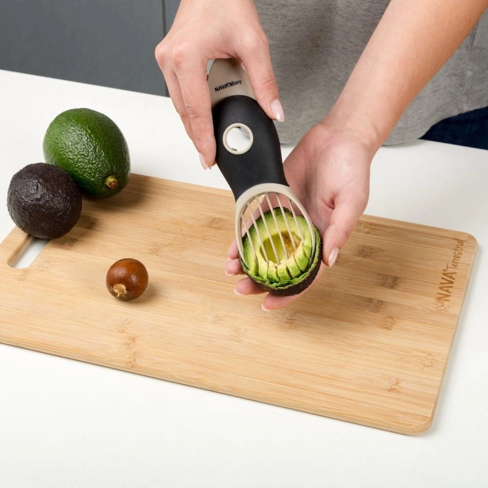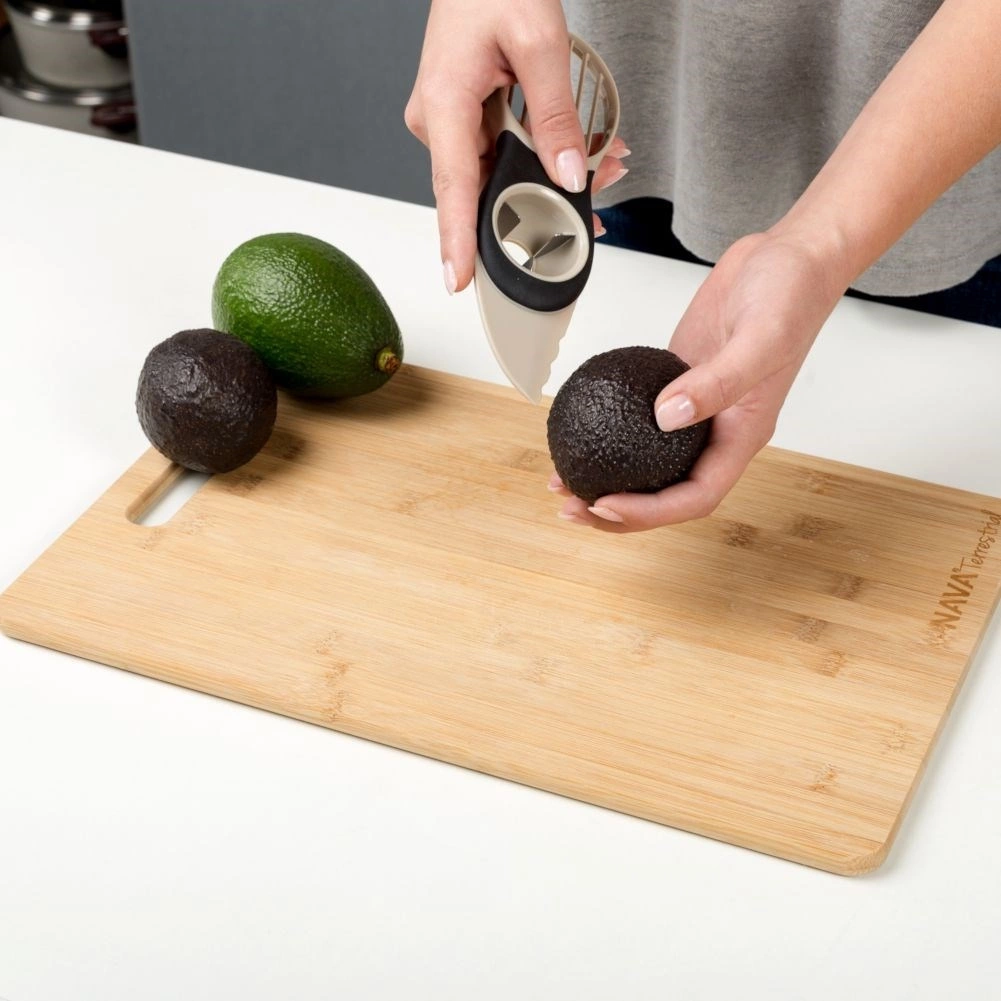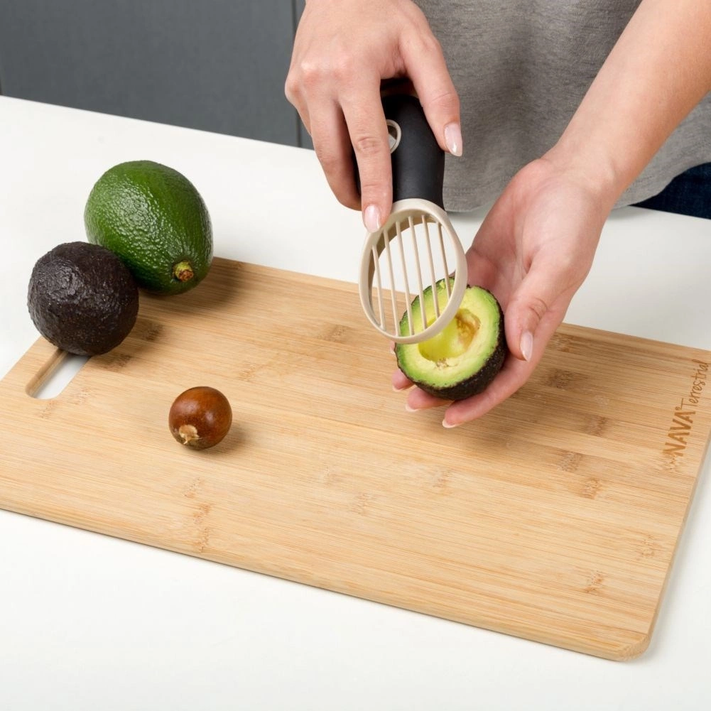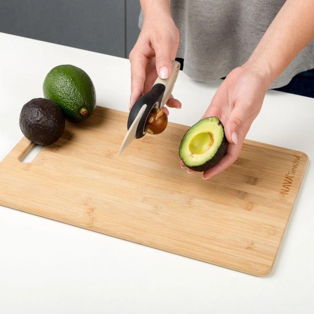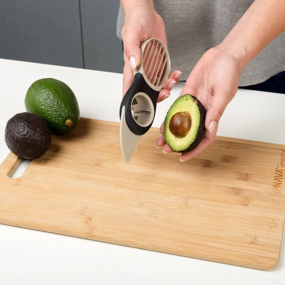 Sprytny, poręczny gadżet do obróbki awokado, to niezbędny przyrząd dla każdego miłośnika tego owocu. Oryginalny produkt greckiej marki NAVA z linii przyborów kuchennych Misty. Wyprodukowano zgodnie z europejskimi standardami.