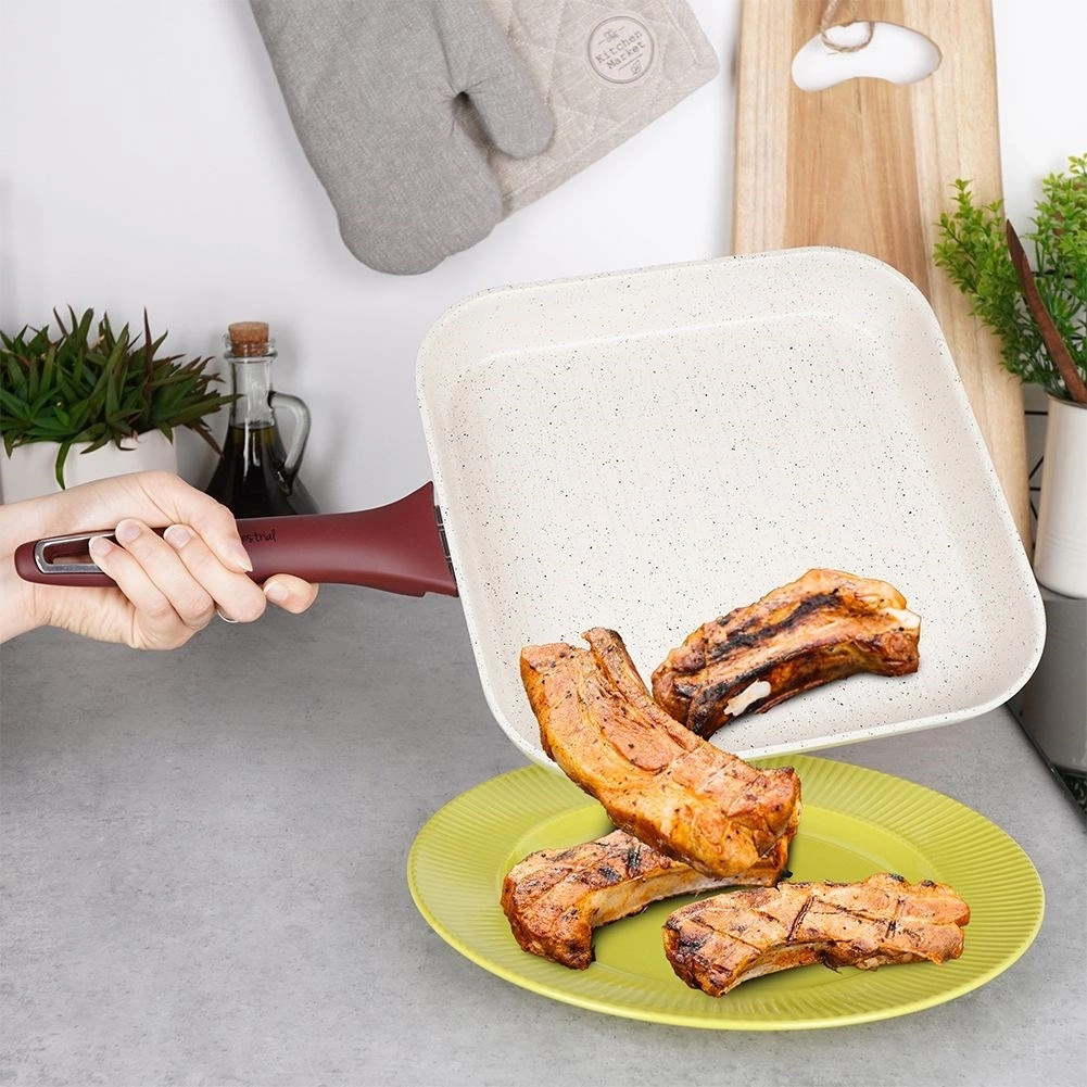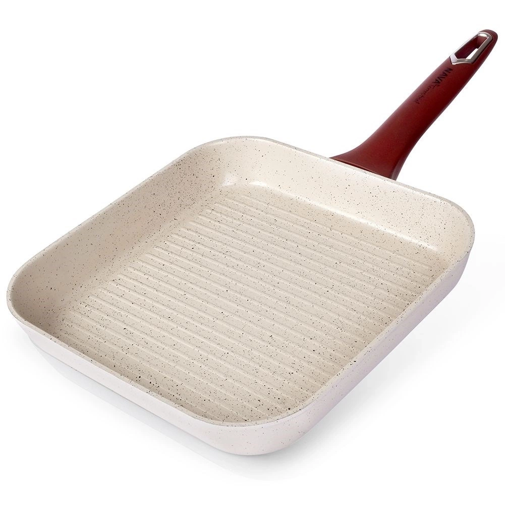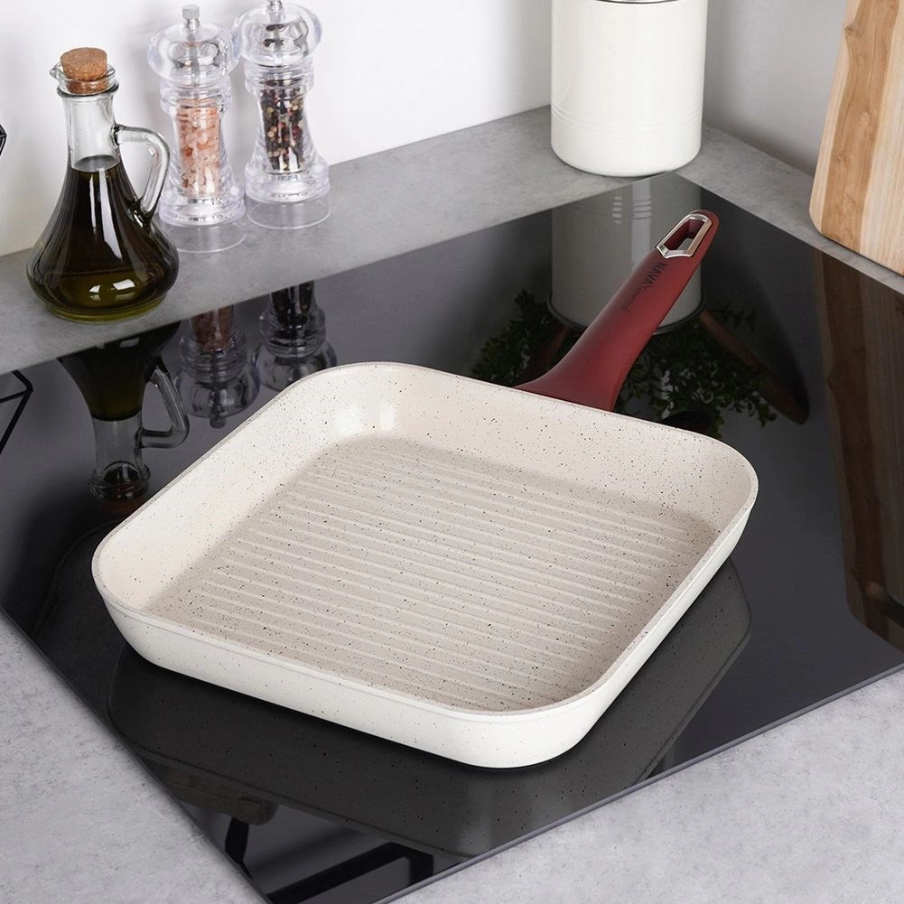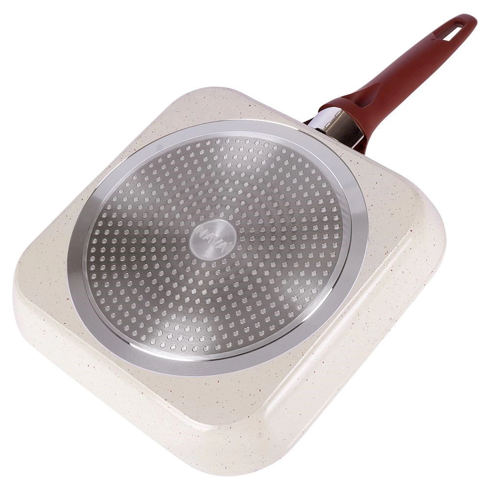 - NIEZAWODNA - Kwadratowa patelnia o wymiarze 27 x 27 cm została wykonana z aluminium, trzywarstwowej ceramicznej powłoki granitowej oraz stalowej wkładki indukcyjnej. Patelnia została zaprojektowana tak aby wytrzymać nagłe zmiany temperatury.