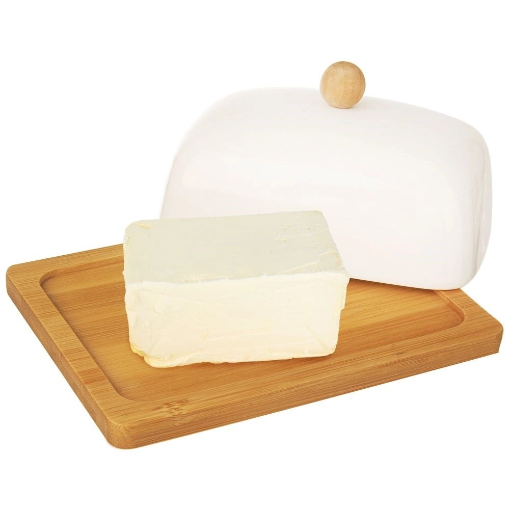 - Maselniczka do przechowywania i serwowania masła. Wykonana z białej porcelany oraz drewna bambusowego.