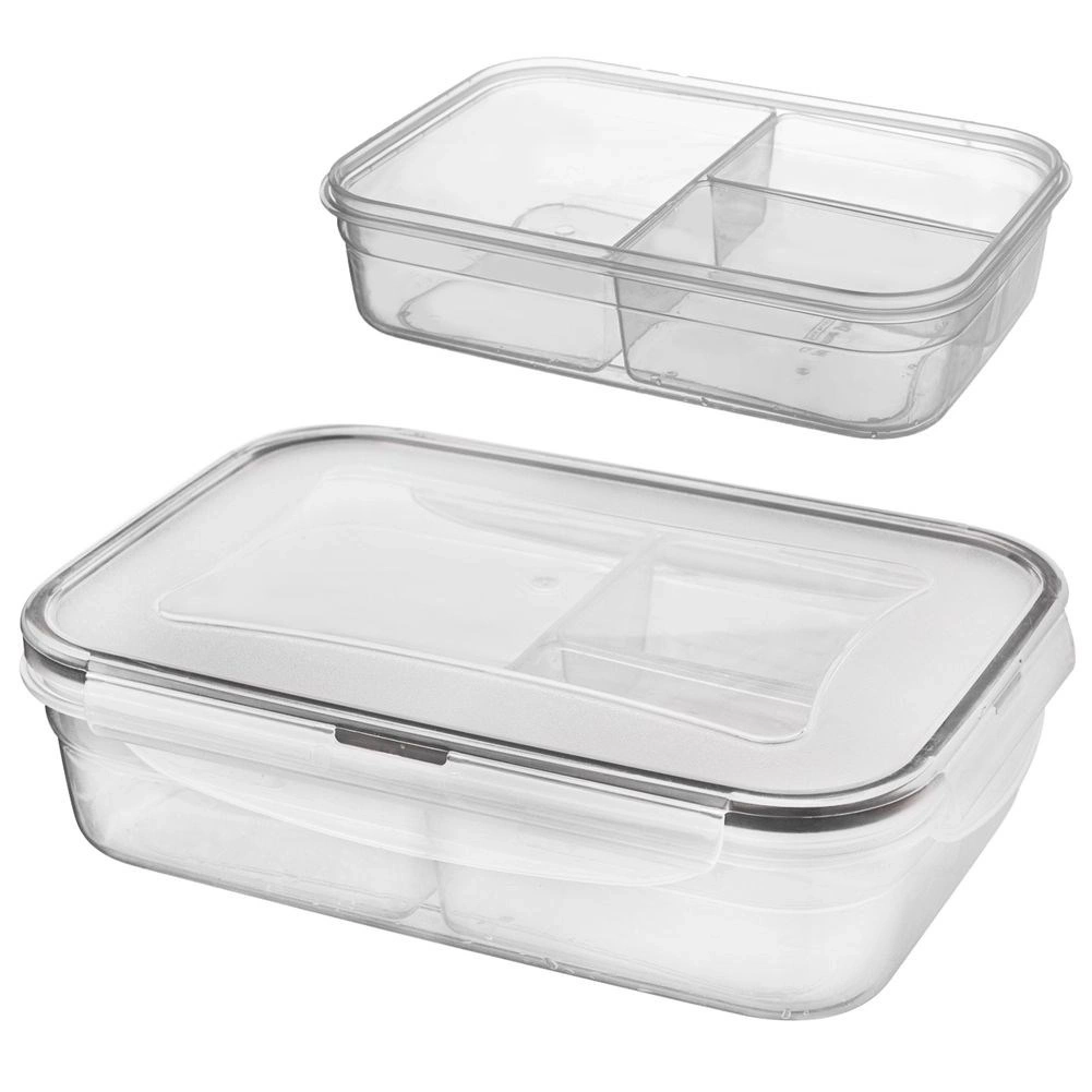 - Dzielony pojemnik na żywność z uszczelką i zatrzaskami do zamknięcia. Posiada trzy wyjmowane wkłady dzielące pojemnik na trzy części. Idealny jako lunchbox.