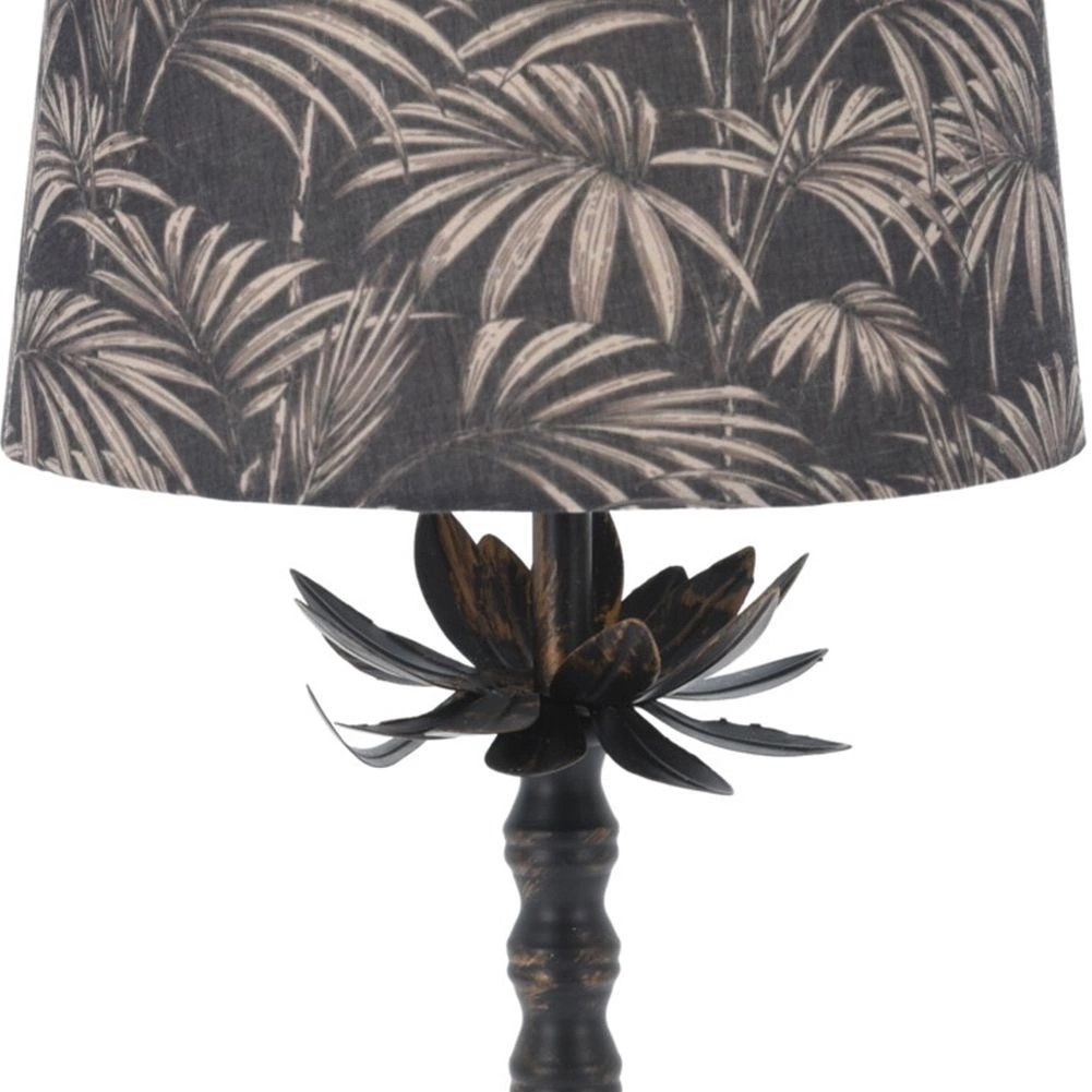 - Lampa stołowa z kloszem w kolorze czarnym z motywem liści. Całość osadzona na metalowej podstawie w podstarzanym stylu. Świetnie sprawdzi się jako lampka do domu, biura, gabinetu.