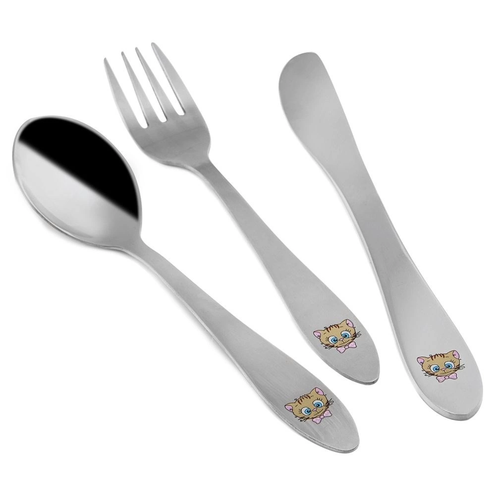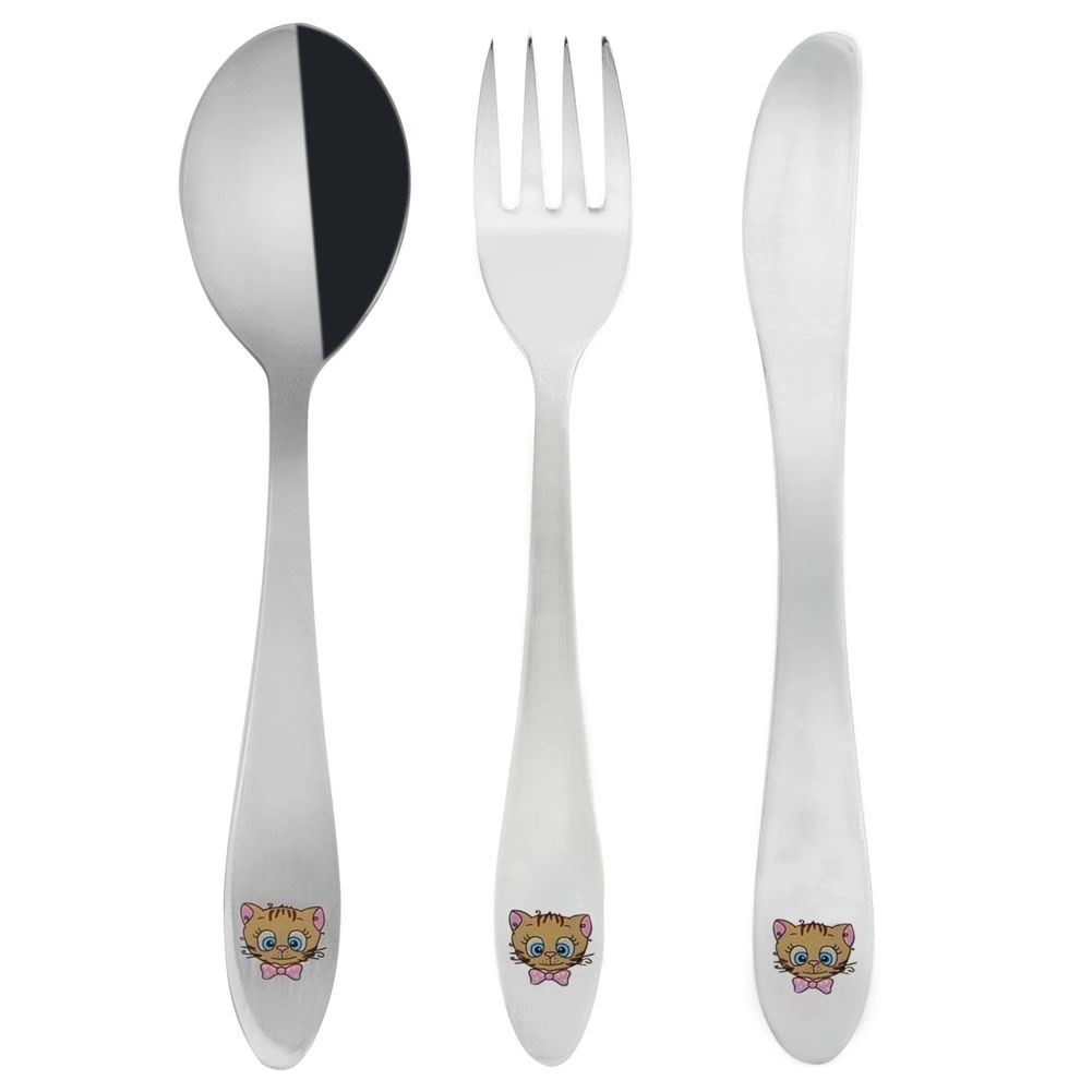 - 3-elementowy zestaw sztućców dla dziecka z dekorem kotka, który zawiera łyżeczkę, widelec oraz nóż. Idealna dla małych fanów kotków.