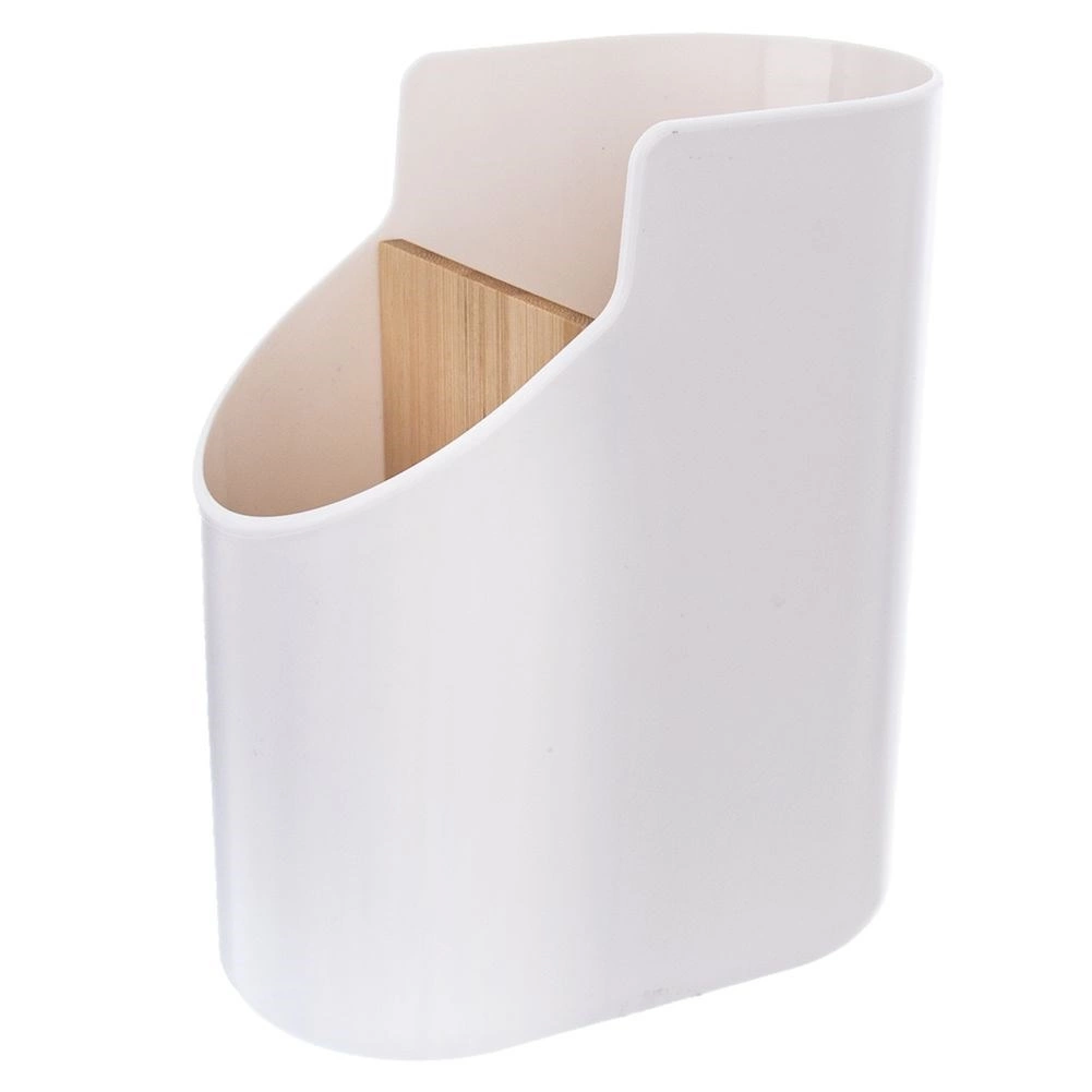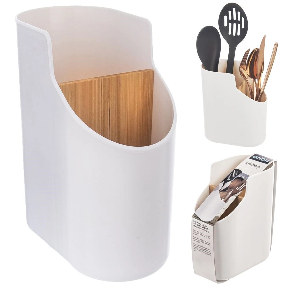 - WYTRZYMAŁY - Pojemnik na sztućce i przybory kuchenne. Wykonany z wysokiej jakości tworzywa w kolorze beżowym a przegródka z drewna bambusowego. Niezwykle lekki.