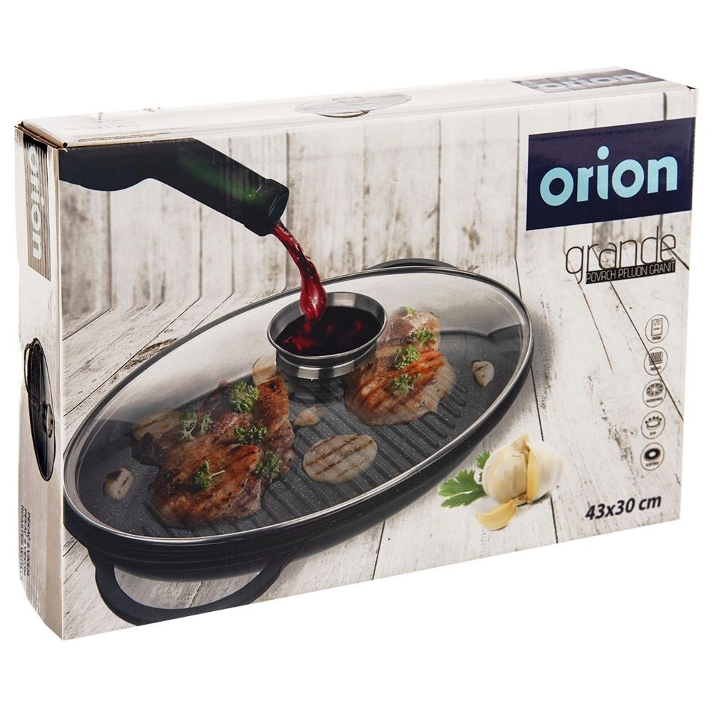 Patelnia grillowa z pokrywką posiadającą dozownik na płynne przyprawy. Wymiar całkowity brytfanny wraz z pokrywką wynosi 43 x 28 x 10 cm. Posiada grillowane dno za pomocą którego przygotujemy mięsa, ryby oraz warzywa. Możliwość stosowania na kuchence oraz w piekarniku. Nie zawiera żadnych toksycznych związków - PFOA, PTFE. Nadaje się do mycia w zmywarce do naczyń. Oryginalny produkt czeskiej marki Orion. W naszej ofercie również inne naczynia z serii GRANDE. Wyprodukowano zgodnie z europejskimi standardami.