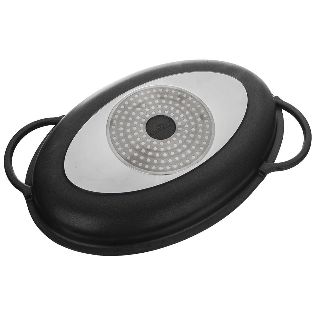 - PRAKTYCZNA - Naczynie sprawdzi się jako patelnia z grillowanym dnem lub brytfanka do pieczenia w piekarniku. Pokrywa wyposażona w dozownik na płynne przyprawy.