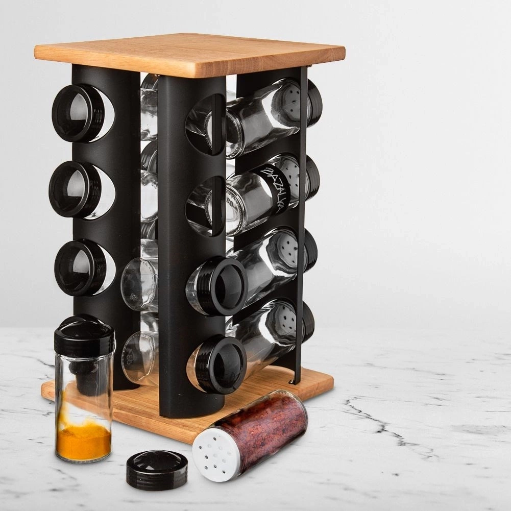 - PRAKTYCZNY - Zestaw składa się z drewnianego stojaka, który jest obrotowy oraz szesnastu szklanych pojemników tej samej wielkości.