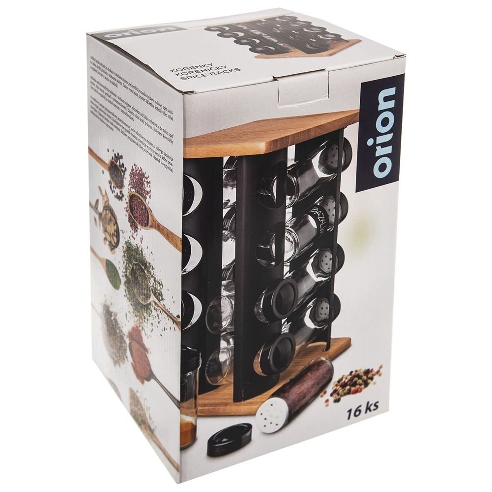 Stojak na przyprawy składający się z 16 sztuk pojemników o pojemności 80 ml i wymiarach 10 x 4,5 cm. Wymiary stojaka to 17,5 x 17,5 x 29 cm. Niezwykle solidny, dzięki niemu w piękny sposób wyeksponujesz ulubione przyprawy. Idealnie nadaje się na prezent np. z okazji parapetówki. Dzięki obrotowej podstawie w łatwy sposób sięgniesz po przyprawę. Zestaw nie zawiera przypraw. Oryginalny produkt czeskiej marki Orion. Wyprodukowano zgodnie z europejskimi standardami.