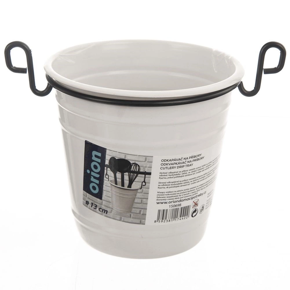 Pojemnik na przybory kuchenne do zawieszenia. Wykonany z metalu w kolorze białym. Wysokość samego pojemnika wynosi 12,5 cm a średnica 13,5 cm. Może służyć również jako osłonka na kwiatki lub zioła. W zestawie mocowanie za pomocą którego możemy pojemnik zawiesić na relingu. Relingi, które umożliwiają zawieszenie pojemnika dostępne są w naszej ofercie. Pojemnika nie należy myć w zmywarce do naczyń. Pojemnik nie zawiera przyborów kuchennych widocznych na zdjęciu. Oryginalny produkt czeskiej marki Orion. Wyprodukowano zgodnie z europejskimi standardami.