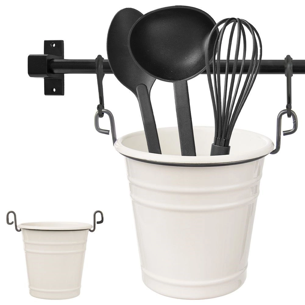 - Pojemnik na przybory kuchenne wykonany z metalu. Możliwość zawieszenia pojemnika na relingu za pomocą haczyków. Świetnie sprawdzi się również jako osłonka na zioła lub kwiatki.