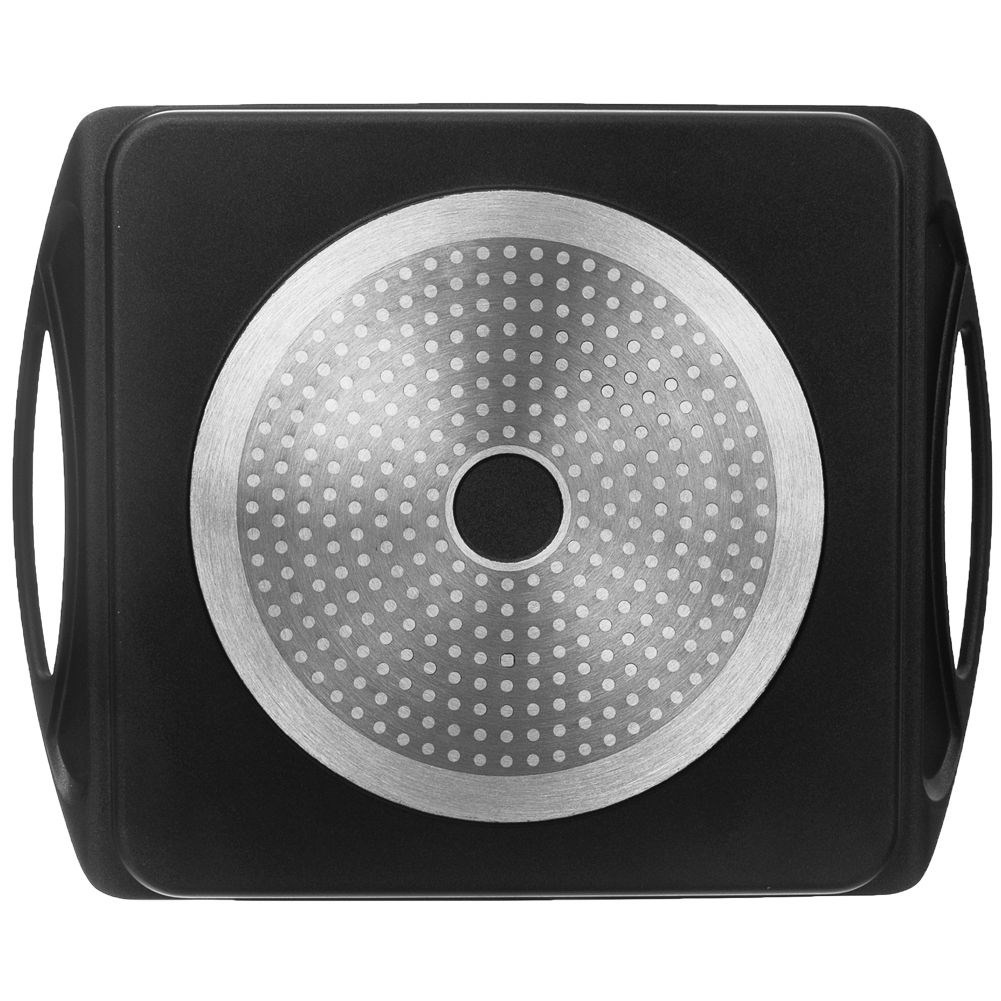- PRAKTYCZNA - Płyta grillowa o wymiarach 34 x 26,5 x 5,5 cm. Przeznaczona do grillowania oraz smażenia. Powierzchnia płyty jest ryflowana. Wyposażona w wygodne uchwyty ułatwiające przenoszenie. Wymiary wewnętrzne patelni wynoszą 25,5 x 25,5 x 2,5 cm.