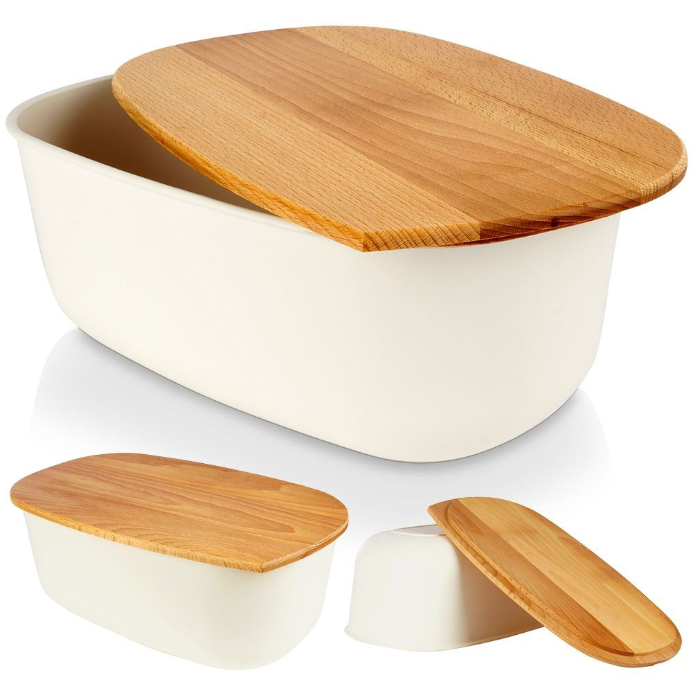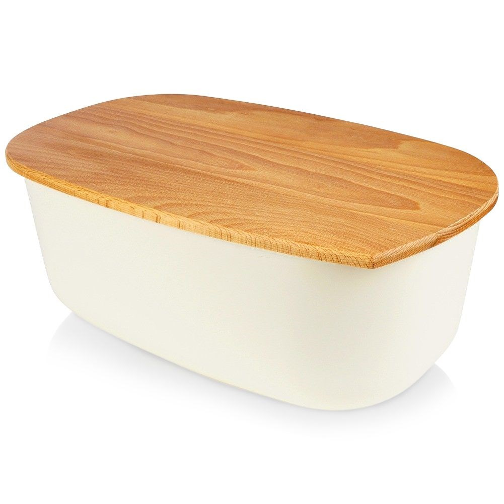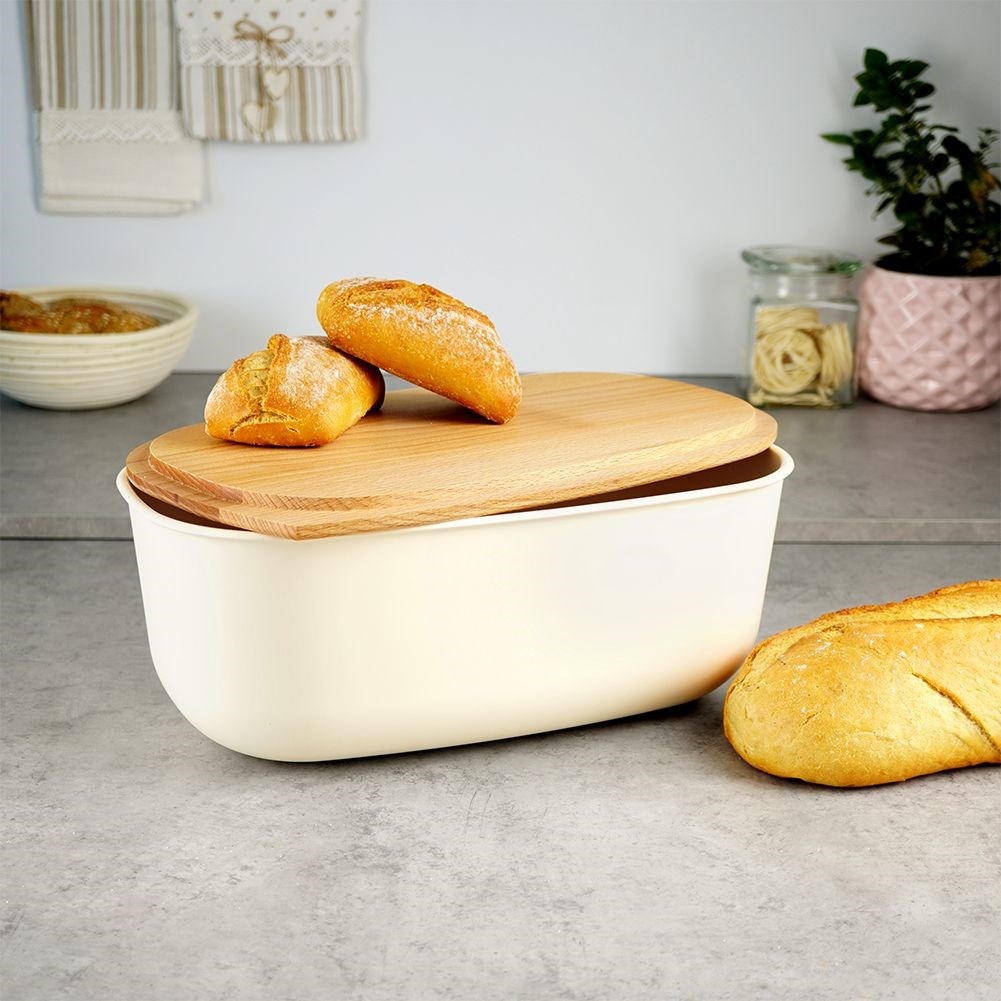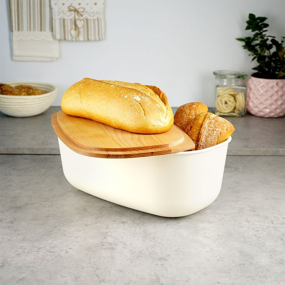- Pojemny chlebak wykonany z wysokiej jakości tworzywa w kremowym kolorze. Posiada pokrywę w formie drewnianej deski, którą wykorzystamy do krojenia pieczywa.