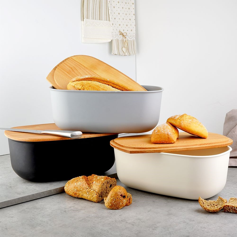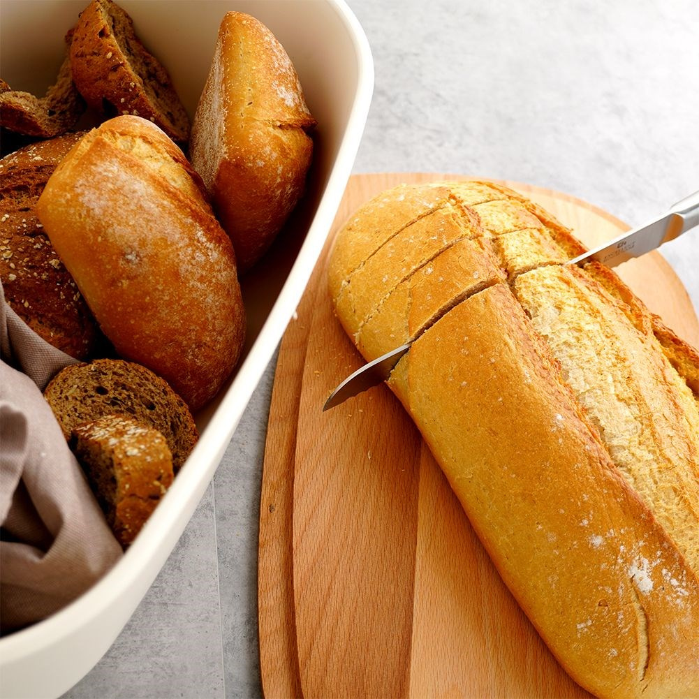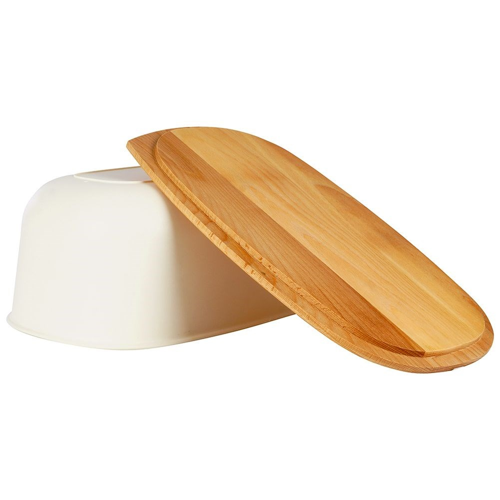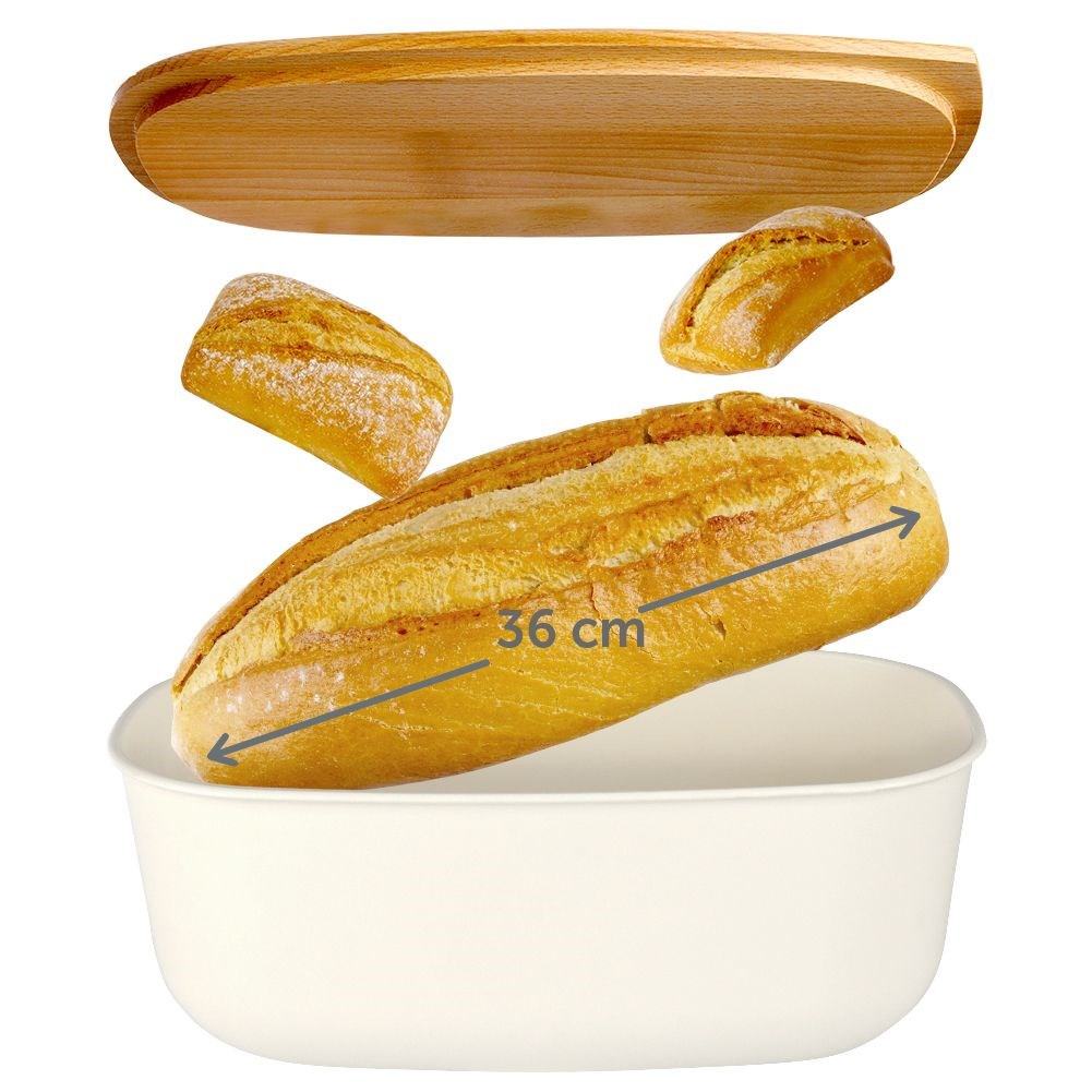 - Pojemny chlebak wykonany z wysokiej jakości tworzywa w kremowym kolorze. Posiada pokrywę w formie drewnianej deski, którą wykorzystamy do krojenia pieczywa.