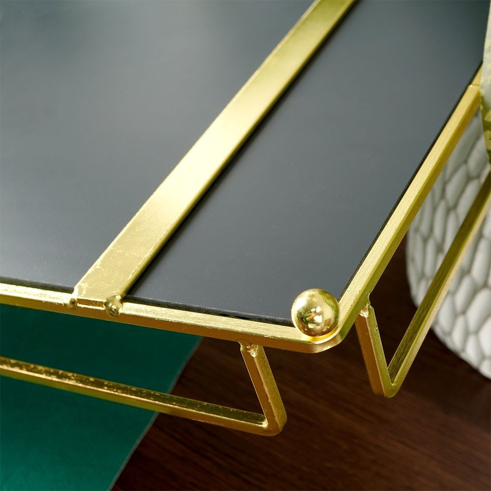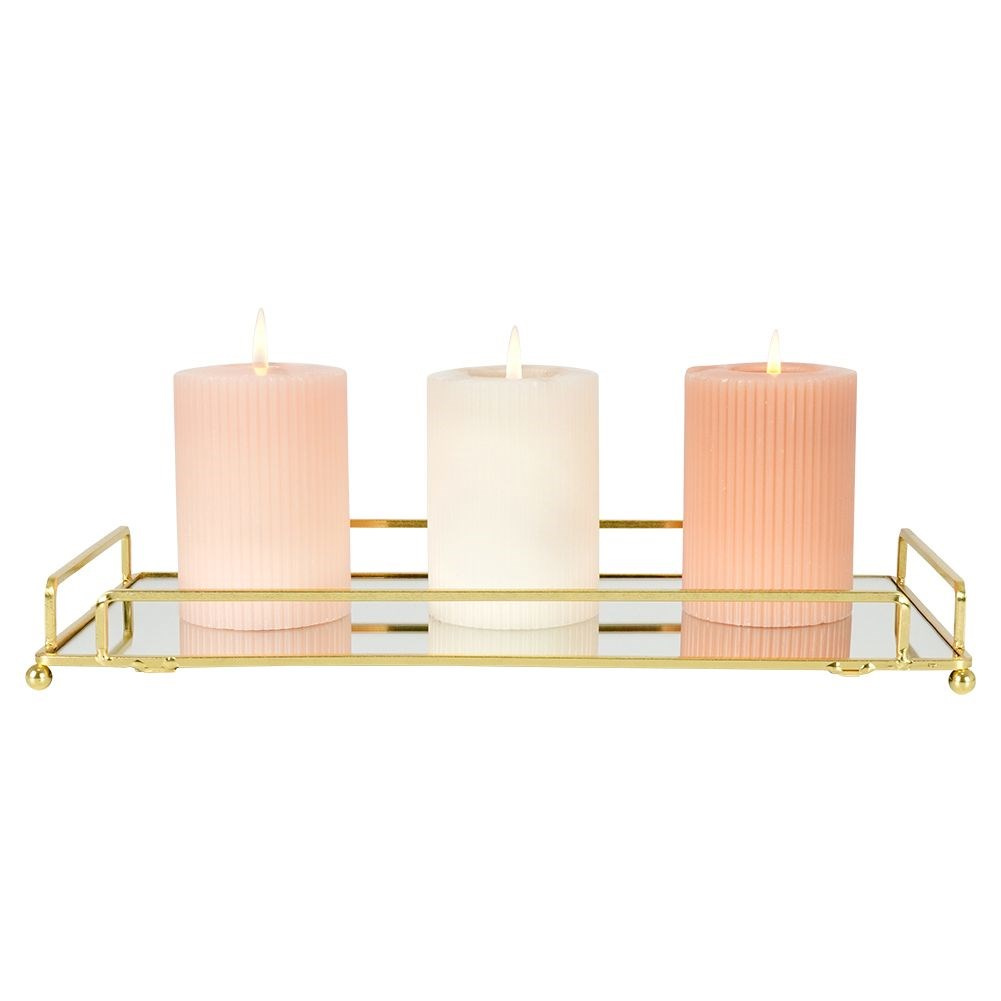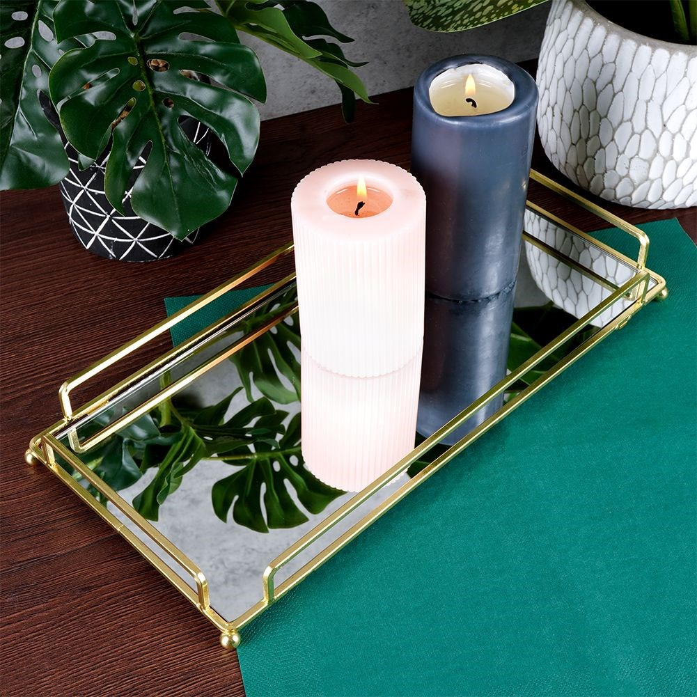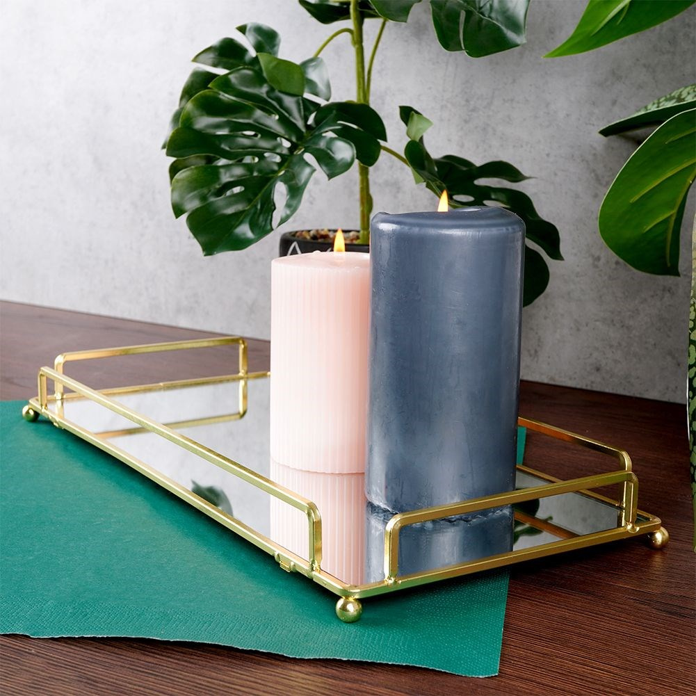 - Prostokątna taca lustrzana na świece o wymiarach 34x16,5 cm. Stanowi wyjątkowy element dekoracyjny. Wykonana z metalu w kolorze złotym oraz tafli lustra.