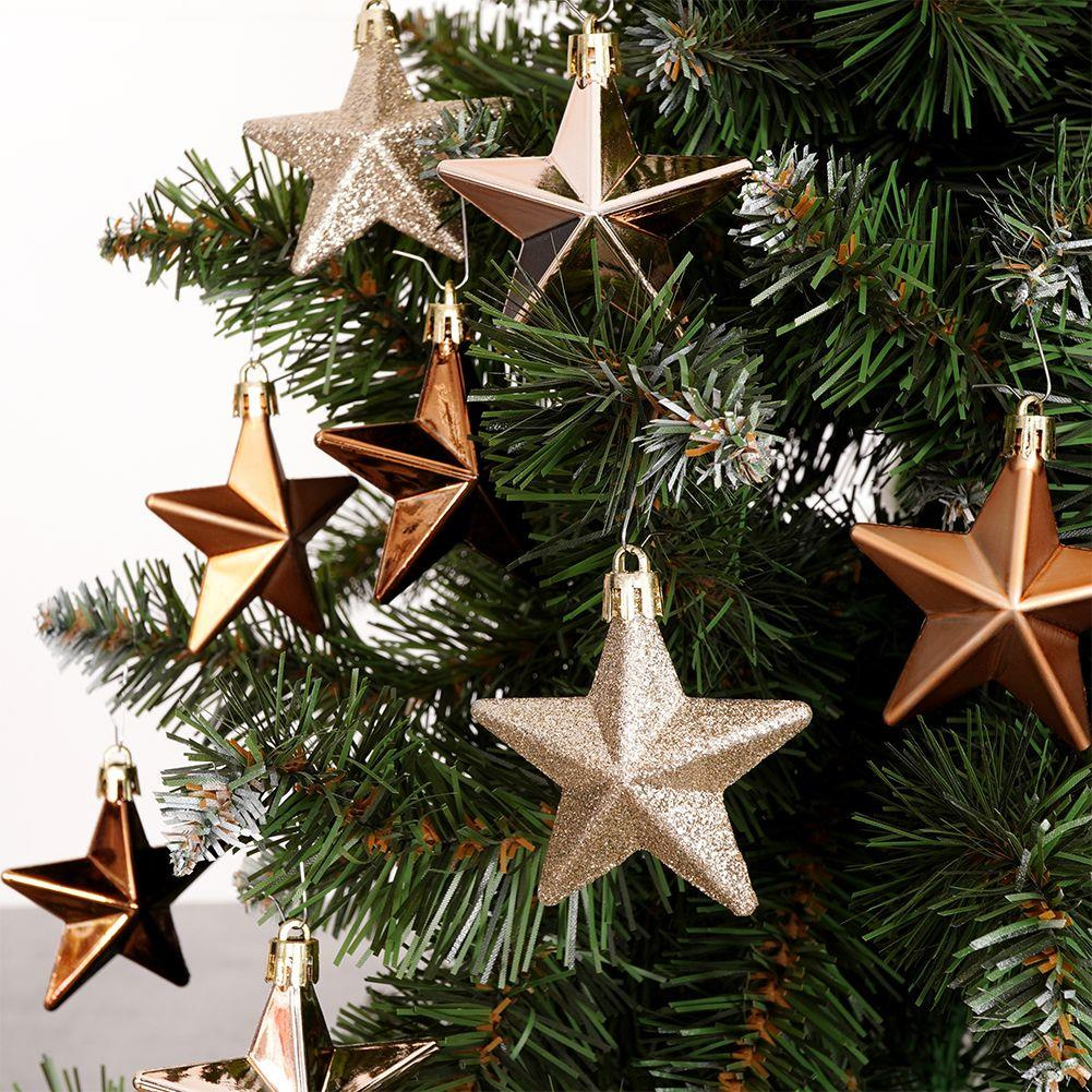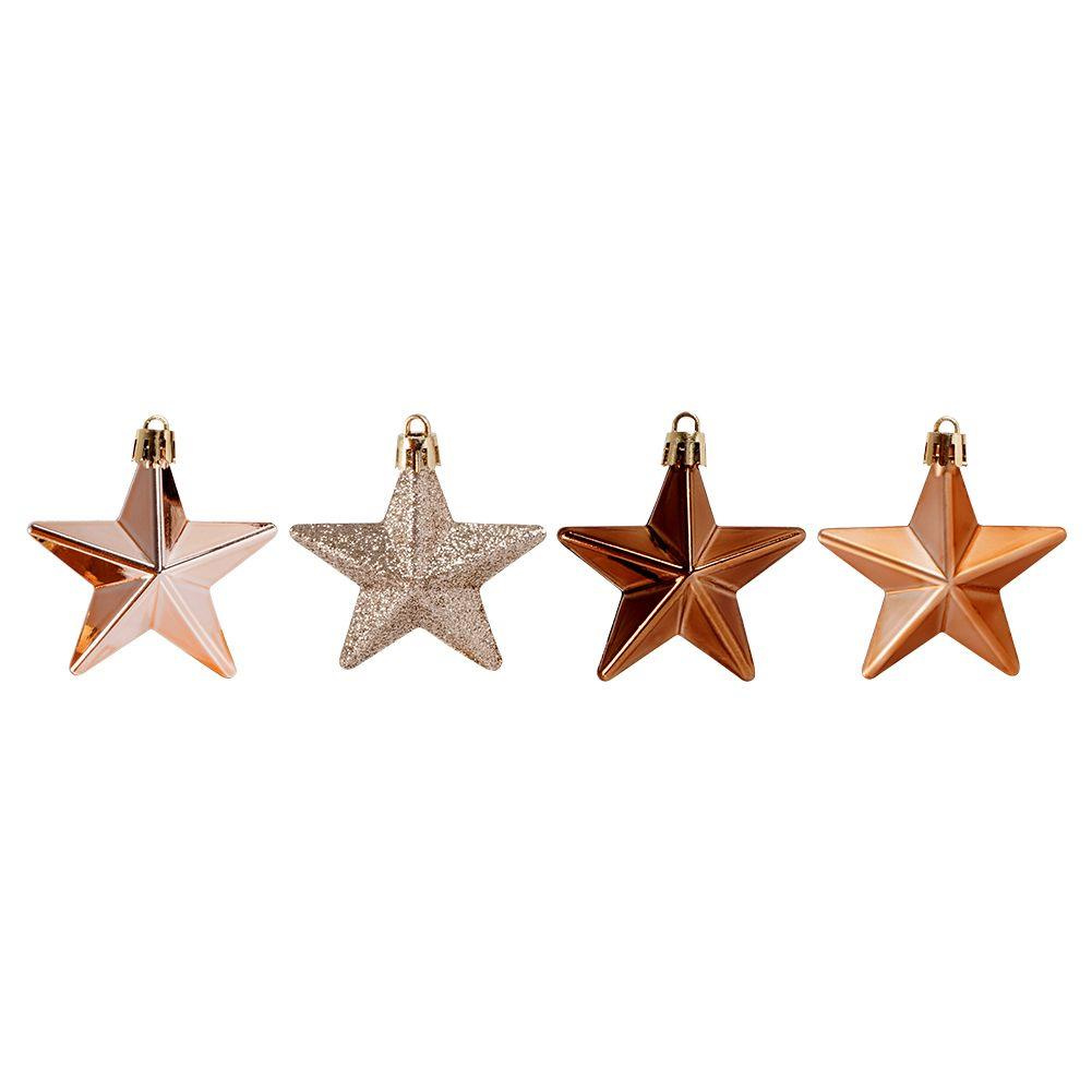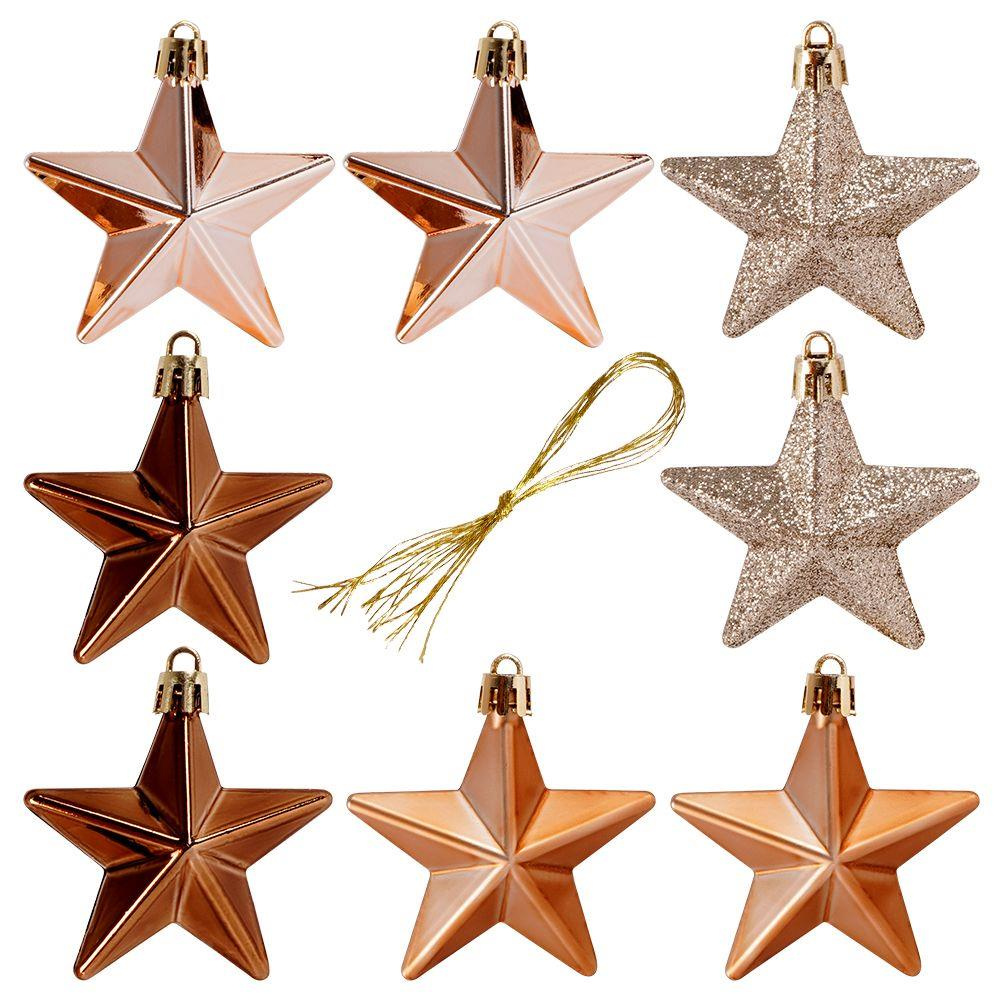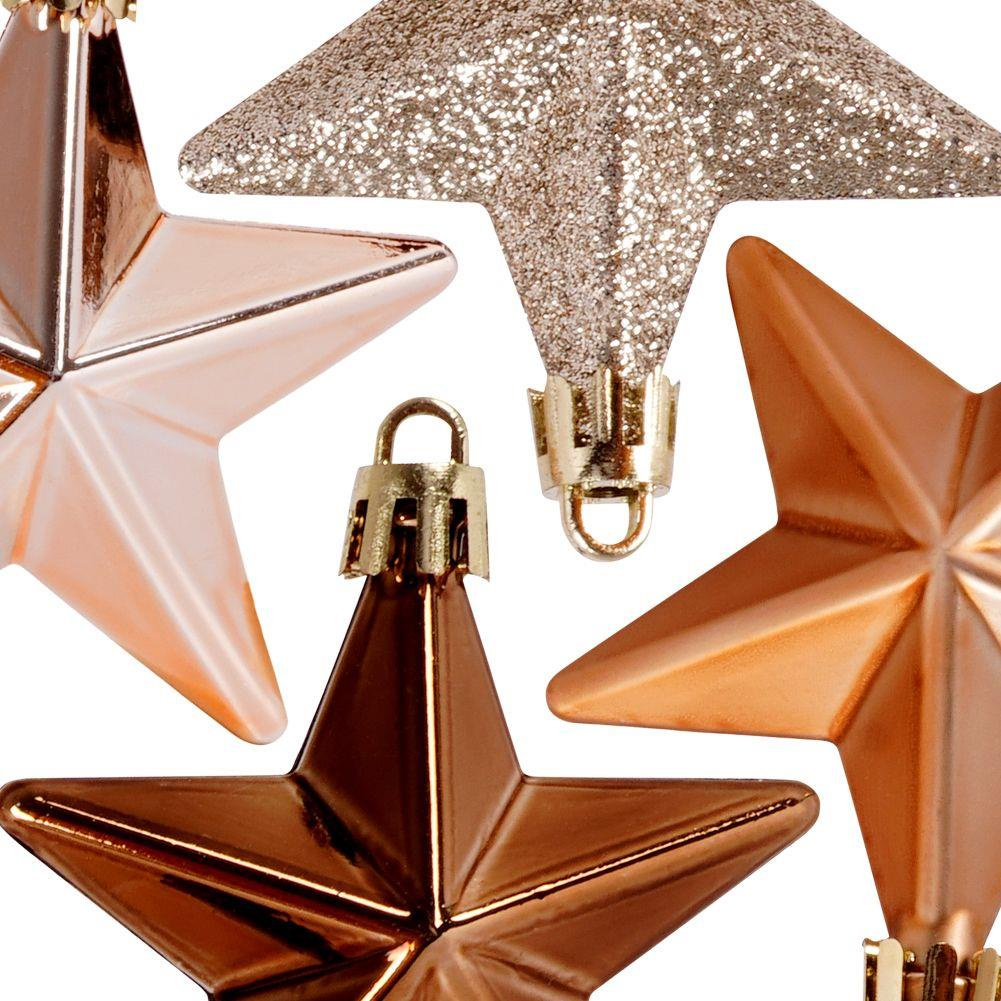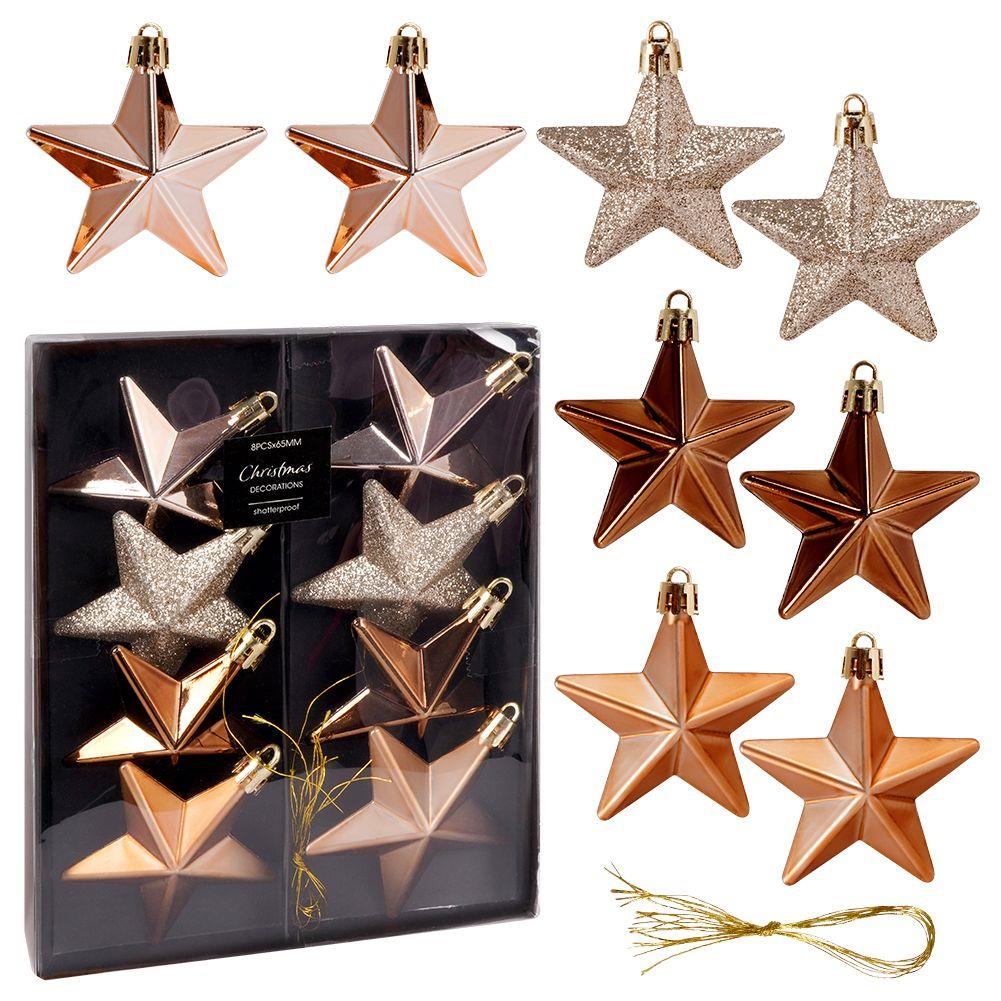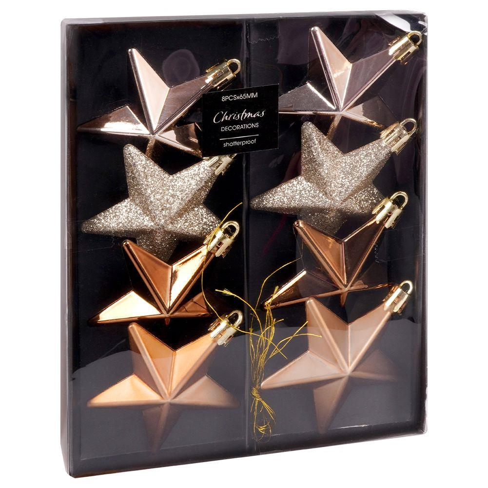 - Zestaw 8 sztuk dekoracyjnych bombek w kształcie gwiazdek. Bombki są nietłukące, trwałe i bezpieczne. W zestawie bombki brokatowe, matowe i błyszczące w odcieniach bursztynu.