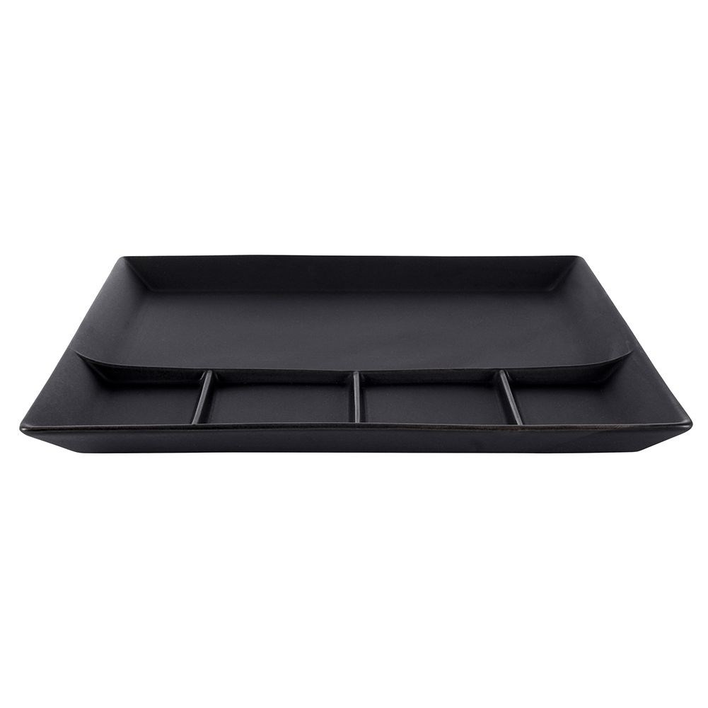 - Kwadratowy talerz do podawania i serwowania przekąsek. Idealny jako talerz obiadowy. Wykonany z porcelany w kolorze czarnym. Talerz dzielony na pięć części.