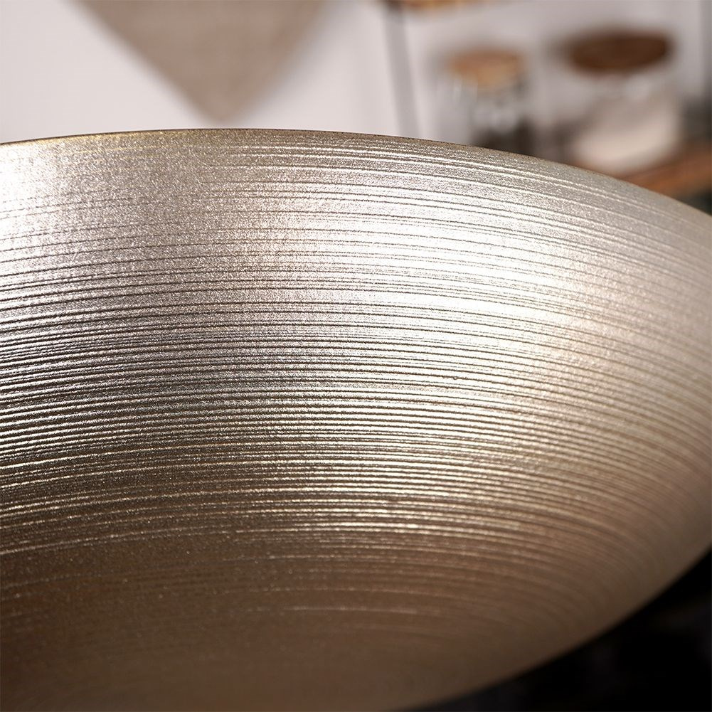 - SZKLANA - Miska wykonana ze szkła malowanego na złoty kolor. Zewnętrzna część miski jest matowa i ma strukturę delikatnych, poziomych prążków, które tworzą efektowną całość.