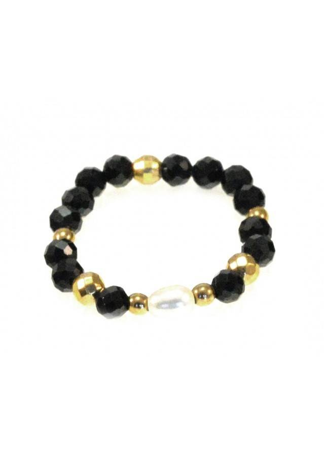 Kamień: Perła hodowalana + Turmalin + srebrny element, pozłacane 24 karatowym żółtym złotem Pierścionek wykonany na bardzo wytrzymałej gumce, odpornej na uszkodzenia.  Rozmiar kamienia: 3/4 mm Rozmiar uniwersalny. Produkt wykonywany ręcznie