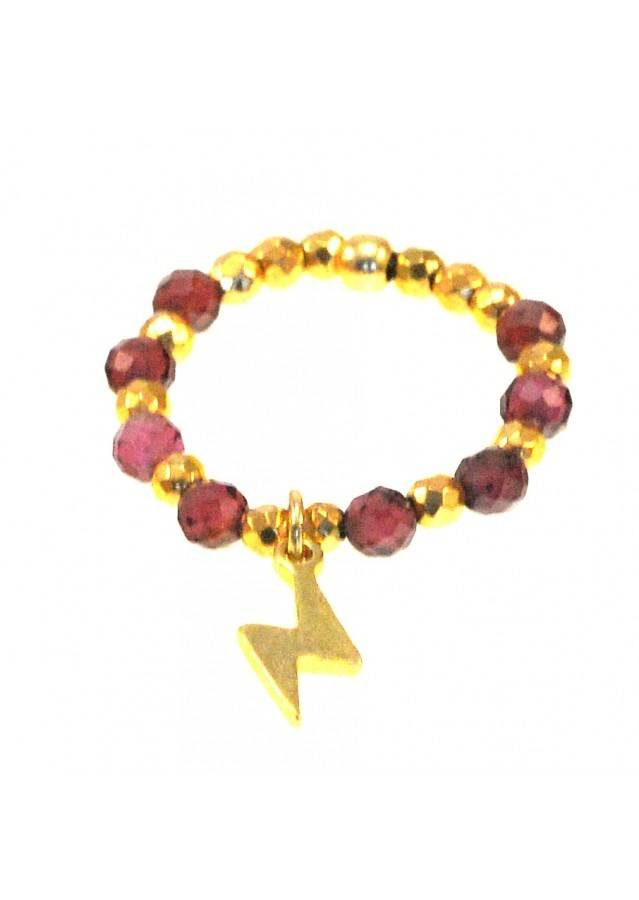 Kamień: Granat+ Hematyt + srebrny element, pozłacane 24 karatowym żółtym złotem Pierścionek wykonany na bardzo wytrzymałej gumce, odpornej na uszkodzenia.  Rozmiar kamienia: 2/3 mm Rozmiar uniwersalny. Produkt wykonywany ręcznie