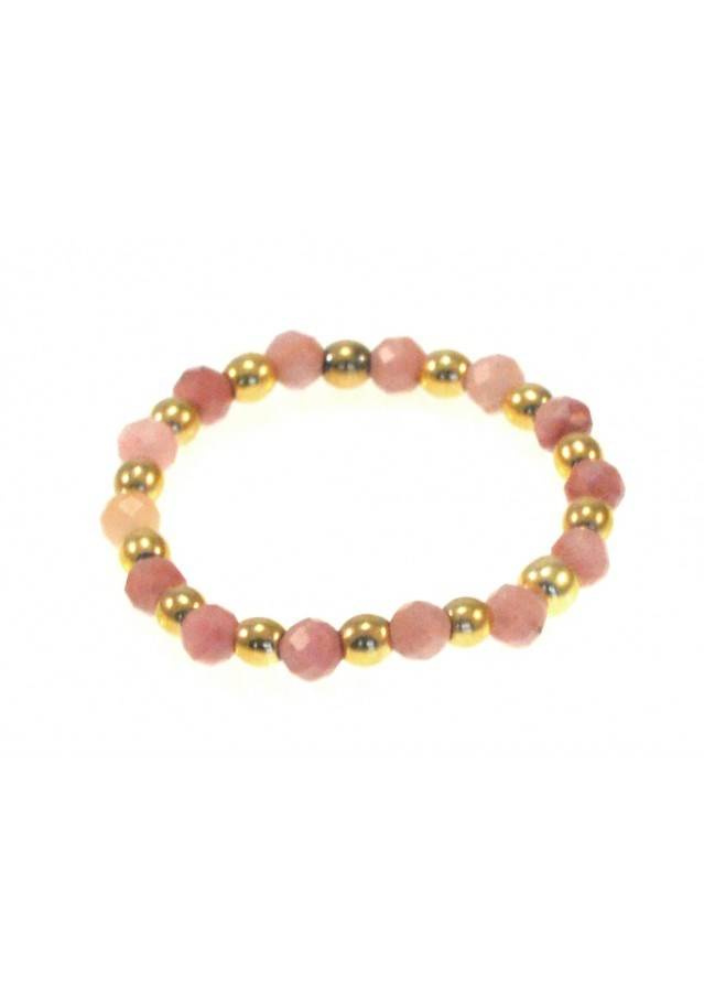 Kamień: Rodonit+ Hematyt  + srebrny element, pozłacane 24 karatowym żółtym złotem Pierścionek wykonany na bardzo wytrzymałej gumce, odpornej na uszkodzenia.  Rozmiar kamienia: 2 mm Rozmiar uniwersalny. Produkt wykonywany ręcznie