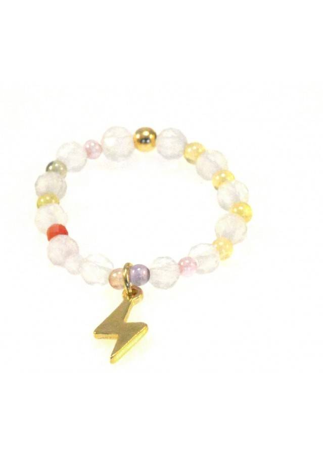 Kamień: Kryształ+ Hematyt + Cyrkonie+ srebrny element, pozłacane 24 karatowym żółtym złotem Pierścionek wykonany na bardzo wytrzymałej gumce, odpornej na uszkodzenia. Rozmiar kamienia: 2/3 mm Rozmiar uniwersalny. Produkt wykonywany ręcznie