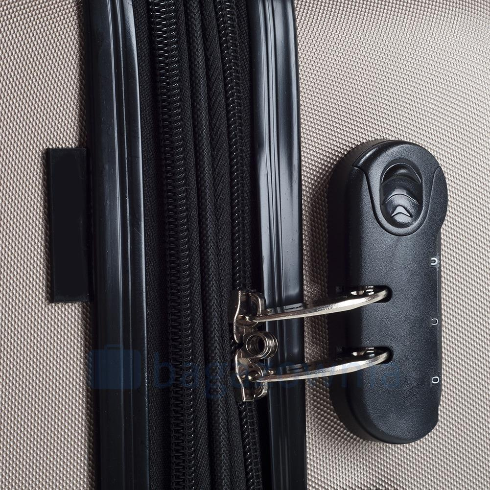 Nowoczesny, lekki model wykonany z bardzo wytrzymałego i odpornego na zarysowanie tworzywa ABS Plus, z dwupoziomową teleskopową rączką. Zewnętrzne, przyjemne w dotyku gumowe uchwyty oraz zamek szyfrowy uniemożliwiający dostanie się do wnętrza osobom niepożądanym. Trwały, duraluminiowy stelaż wbudowany w walizkę. Wyposażony w cztery odpinane, obrotowe kauczukowe kółka, które zapewniają stabilność oraz lekkość prowadzenia w dowolnym kierunku. Wnętrze w ciemnym sygnowanym kolorze dzielone zamkiem błyskawicznym na dwie funkcjonalne komory.