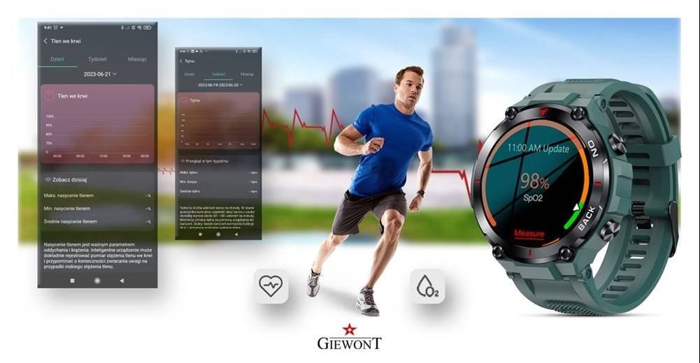 Dzięki sensorowi możesz w każdej chwili zmierzyć lub wykonać pomiar: tętno lub saturację - zawartość tlenu we krwi w swoim organizmie. Kontroluj wyniki podczas każdej aktywności fizycznej. Niezależnie czy jeździsz na rowerze, biegasz, czy też po prostu jesteś w pracy lub odpoczywasz. Twój smartwatch Giewont stanie się osobistym asystentem dbającym o twoje zdrowie każdego dnia.