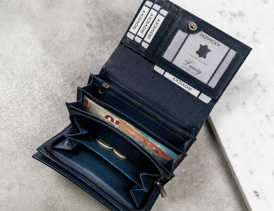 - 6 kieszonek na dokumenty w większym formacie, jak dowód rejestracyjny w okładce. Dwie z tych kieszonek mieszczą się po zewnętrznej części, z tyłu portfela, jedna z nich jest otwarta, druga zamknięta na zameczek. Zalecamy jednak, by ważne dokumenty przechowywać wewnątrz, zamykanego napą portfela.