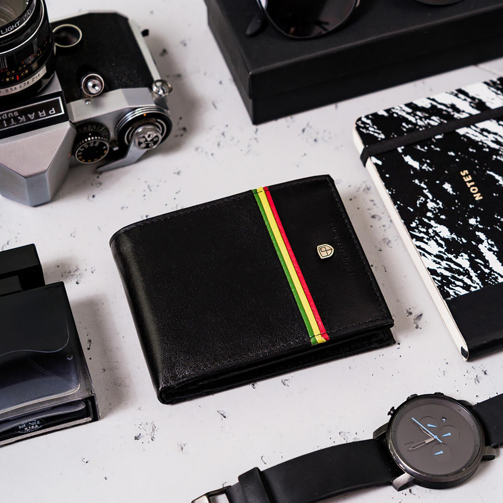 - Idealny upominek | Portfel o klasycznym fasonie bez zapięcia zewnętrznego. Ozdobiony paskiem w barwach symbolizujących ruch Rastafari